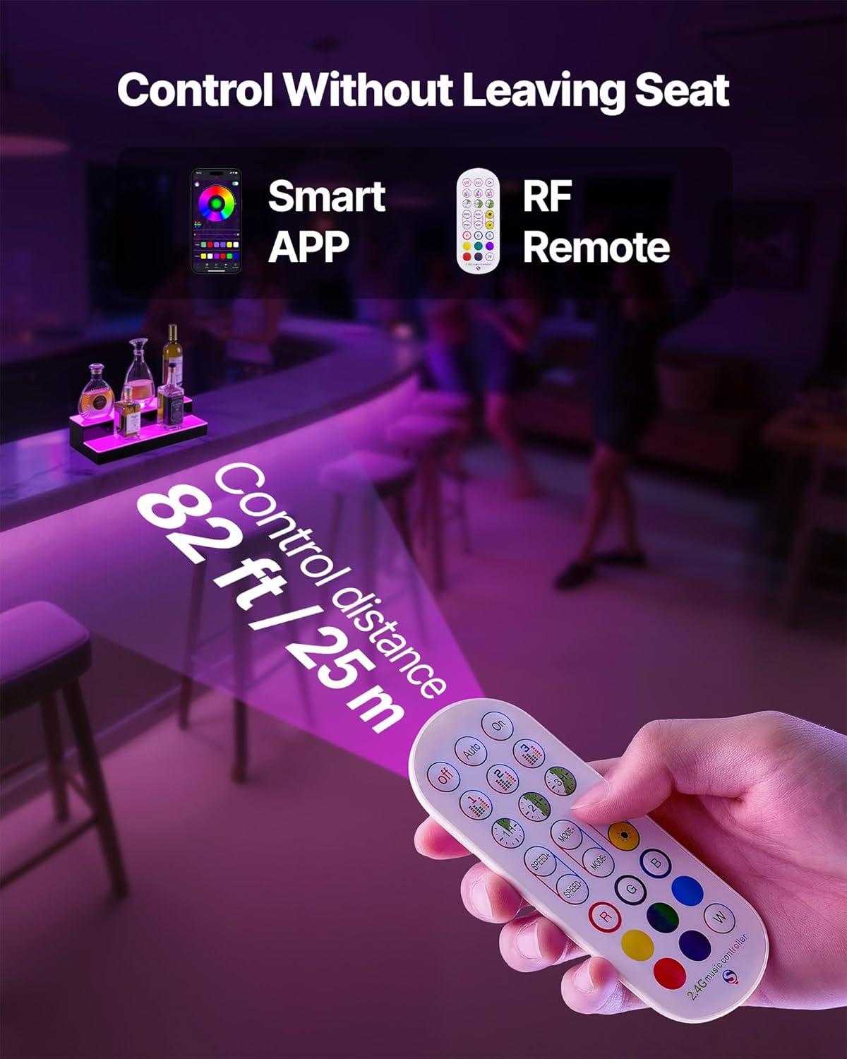 Multiple Control Methods: Supports dual distant wireless control via RF remote (up to 82ft) & smart app (up to 33ft), unlocking brightness, speed, timing, and music-sync lighting controls for personalized ambiance