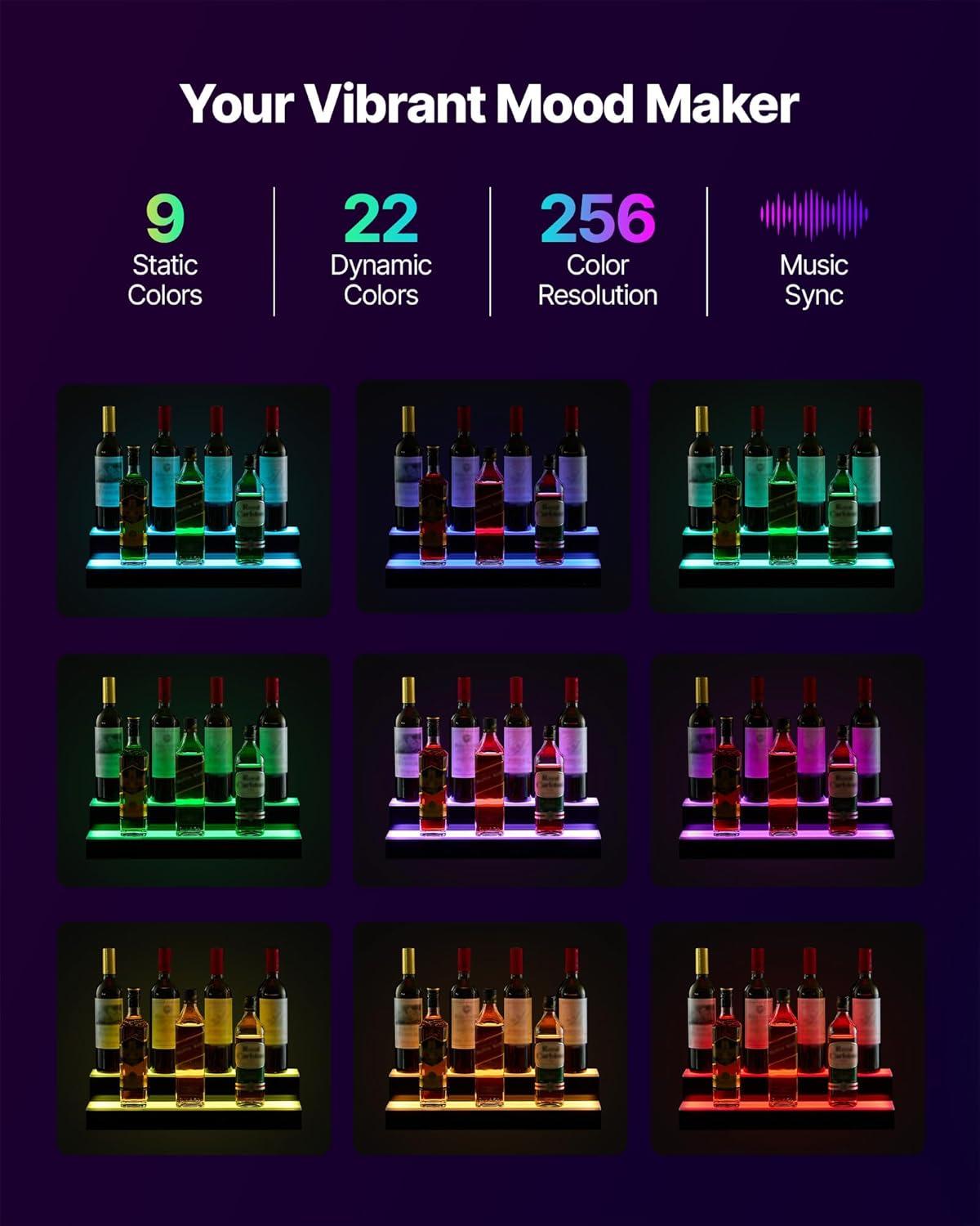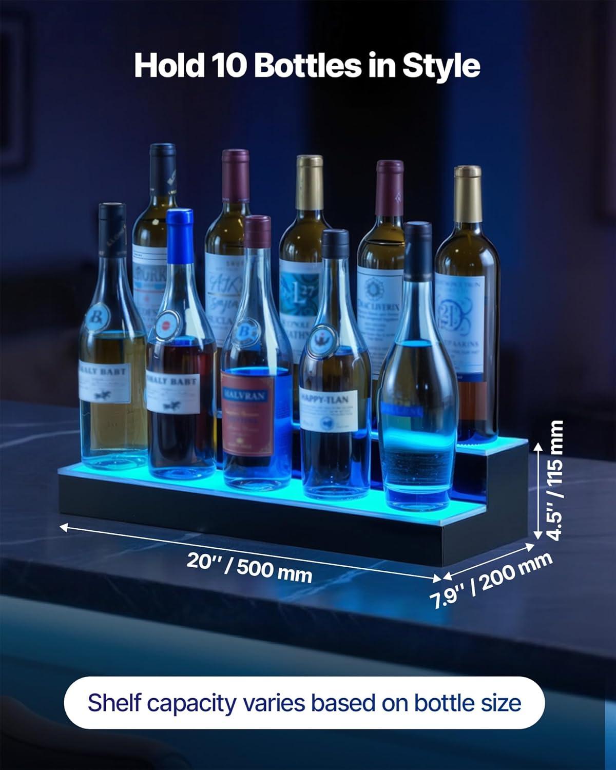 Get more for your money with our exclusive bundle deals on VEVOR LED Lighted Liquor Bottle Display, 1 Tier 60 Inches Whiskey Rack, Supports USB, Illuminated Home Bar Shelf with RF Remote & App Control, 7 Static Colors, Acrylic Lighted Shelf for 15 Bottles(2 Step 20 Inches) and accessories.