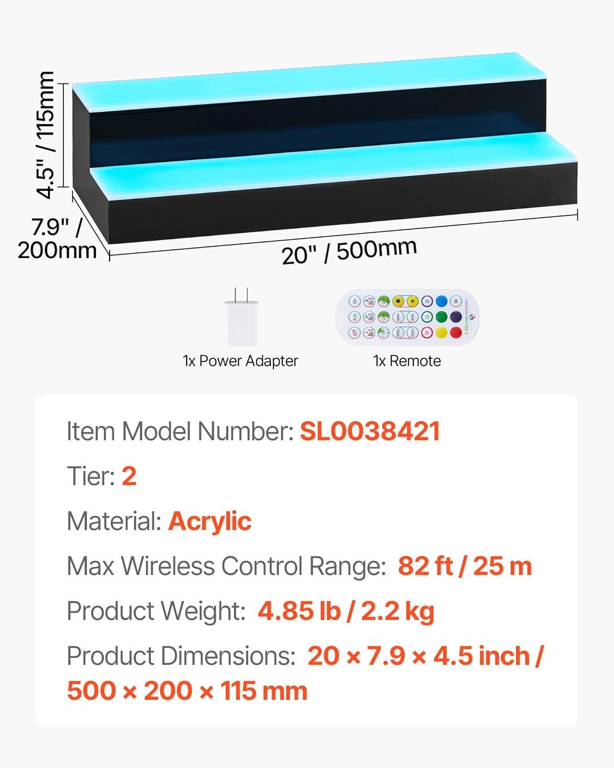 VEVOR LED Lighted Liquor Bottle Display, 1 Tier 60 Inches Whiskey Rack, Supports USB, Illuminated Home Bar Shelf with RF Remote & App Control, 7 Static Colors, Acrylic Lighted Shelf for 15 Bottles(2 Step 20 Inches)