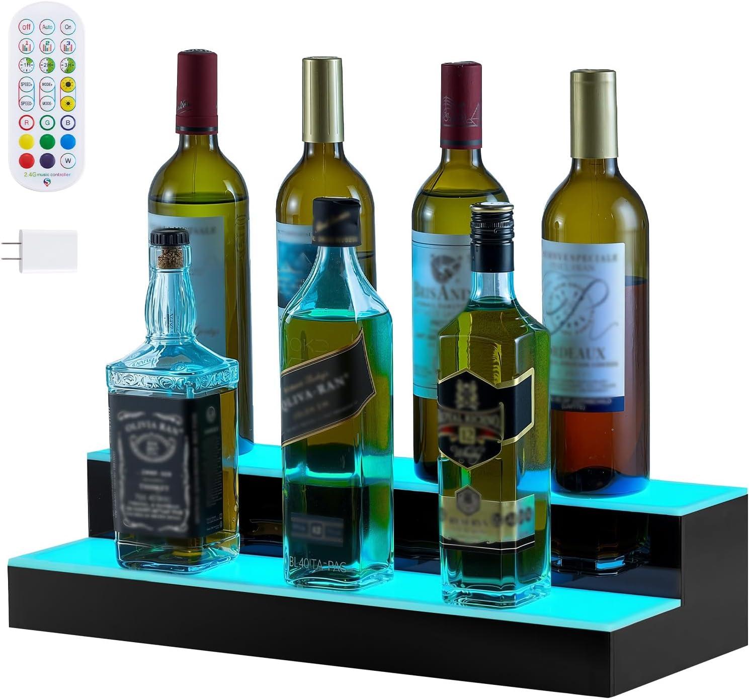 VEVOR LED Lighted Liquor Bottle Display, 1 Tier 60 Inches Whiskey Rack, Supports USB, Illuminated Home Bar Shelf with RF Remote & App Control, 7 Static Colors, Acrylic Lighted Shelf for 15 Bottles(2 Step 24 Inches)