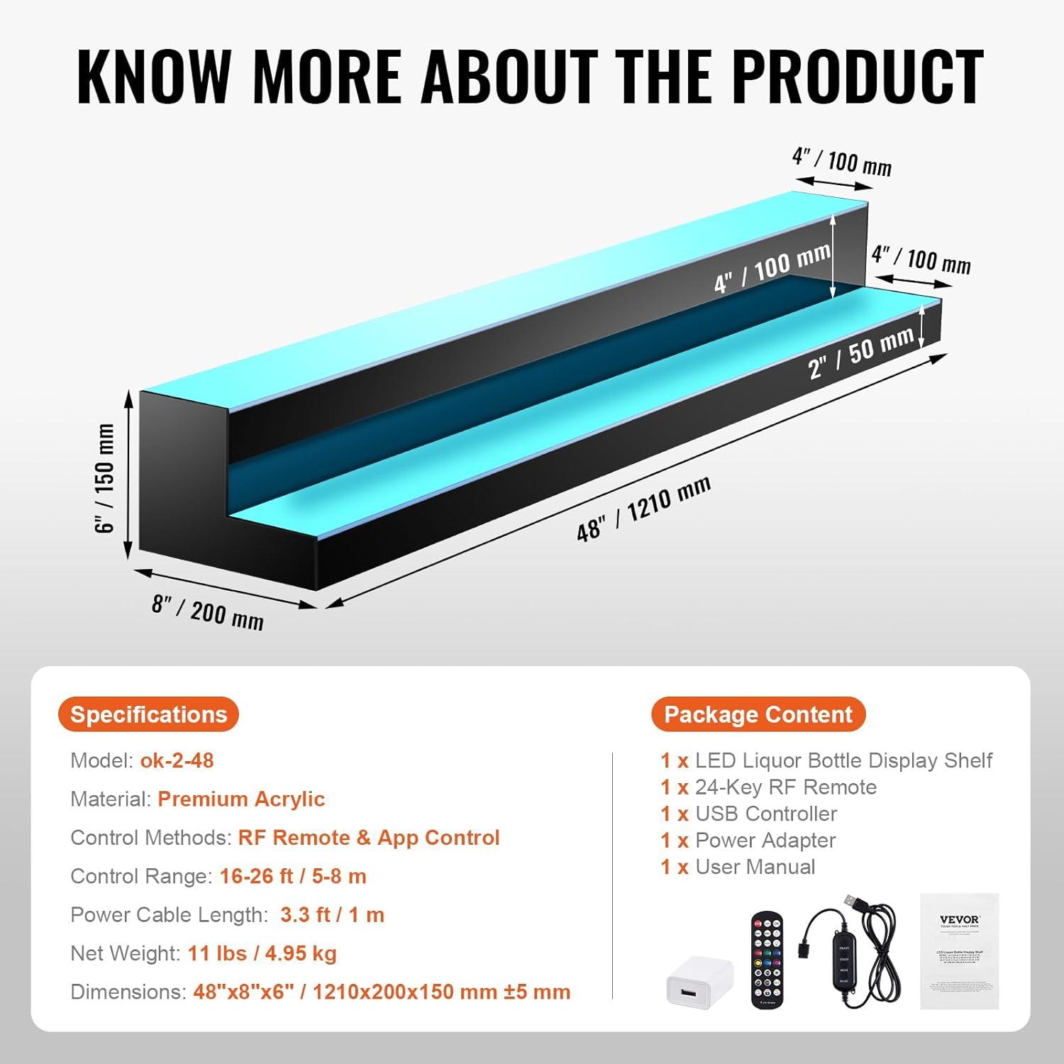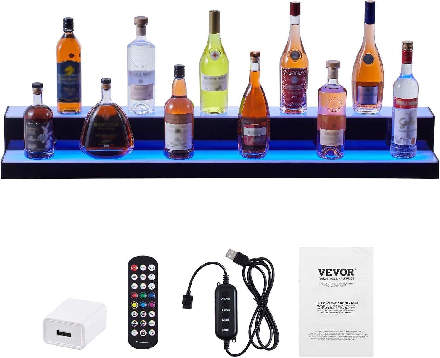 VEVOR LED Lighted Liquor Bottle Display, 1 Tier 60 Inches Whiskey Rack, Supports USB, Illuminated Home Bar Shelf with RF Remote & App Control, 7 Static Colors, Acrylic Lighted Shelf for 15 Bottles(2 Step 48 Inches)