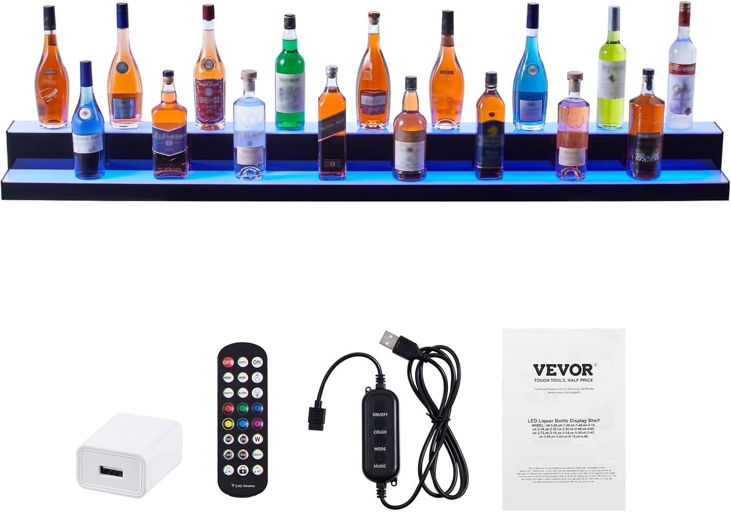 VEVOR LED Lighted Liquor Bottle Display, 1 Tier 60 Inches Whiskey Rack, Supports USB, Illuminated Home Bar Shelf with RF Remote & App Control, 7 Static Colors, Acrylic Lighted Shelf for 15 Bottles(2 Step 60 Inches)