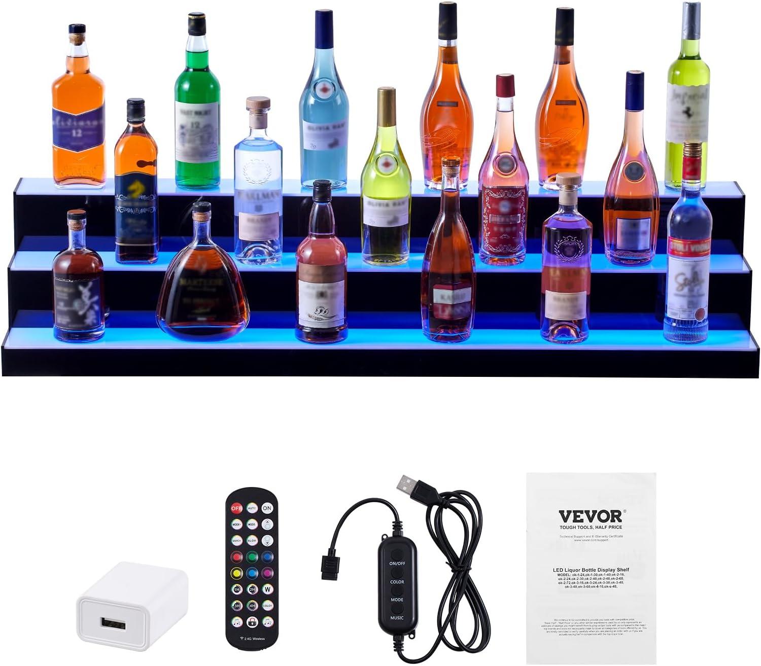 VEVOR LED Lighted Liquor Bottle Display, 1 Tier 60 Inches Whiskey Rack, Supports USB, Illuminated Home Bar Shelf with RF Remote & App Control, 7 Static Colors, Acrylic Lighted Shelf for 15 Bottles(3 Step 48 Inches)