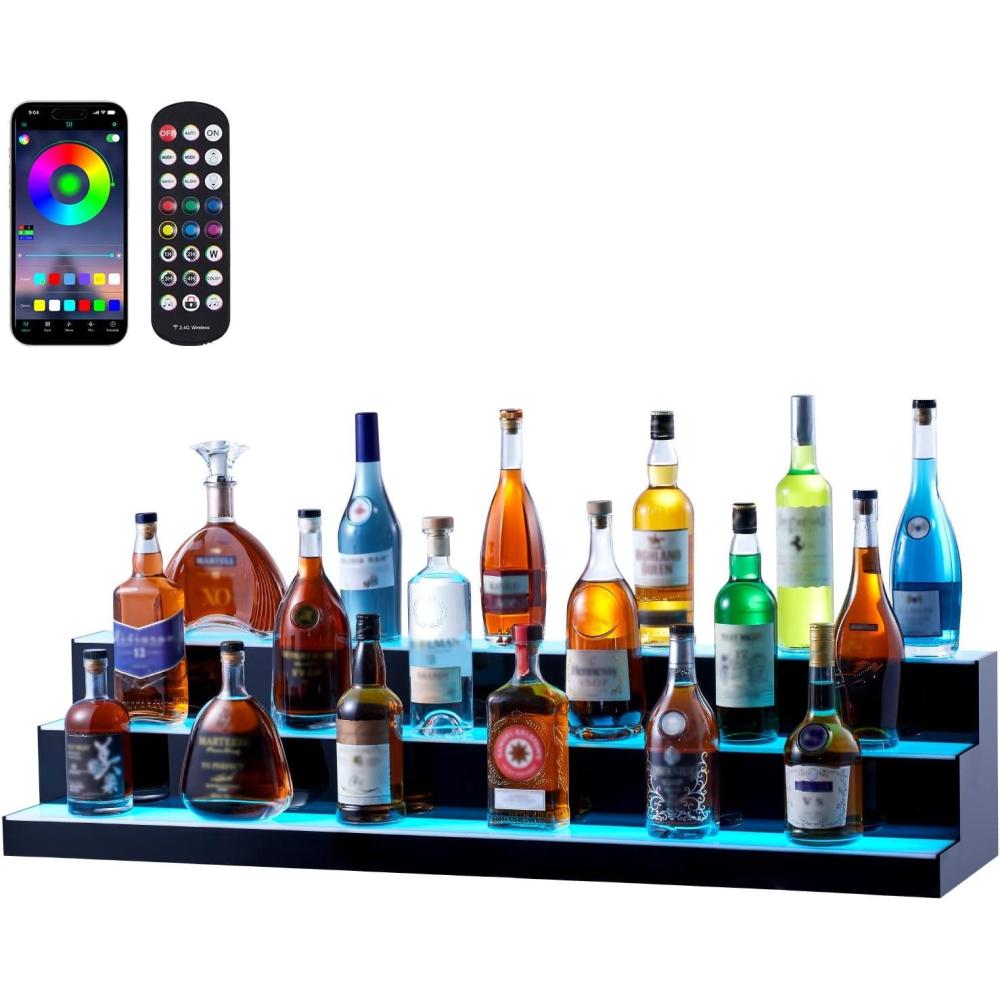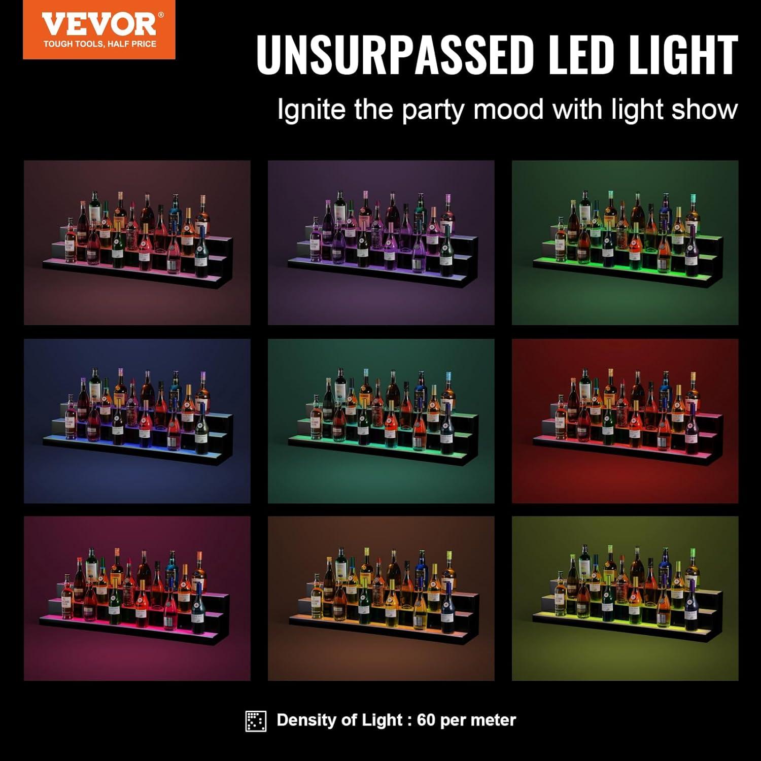 VEVOR LED Lighted Liquor Bottle Display, 1 Tier 60 Inches Whiskey Rack, Supports USB, Illuminated Home Bar Shelf with RF Remote & App Control, 7 Static Colors, Acrylic Lighted Shelf for 15 Bottles(3 Step 60 Inches)
