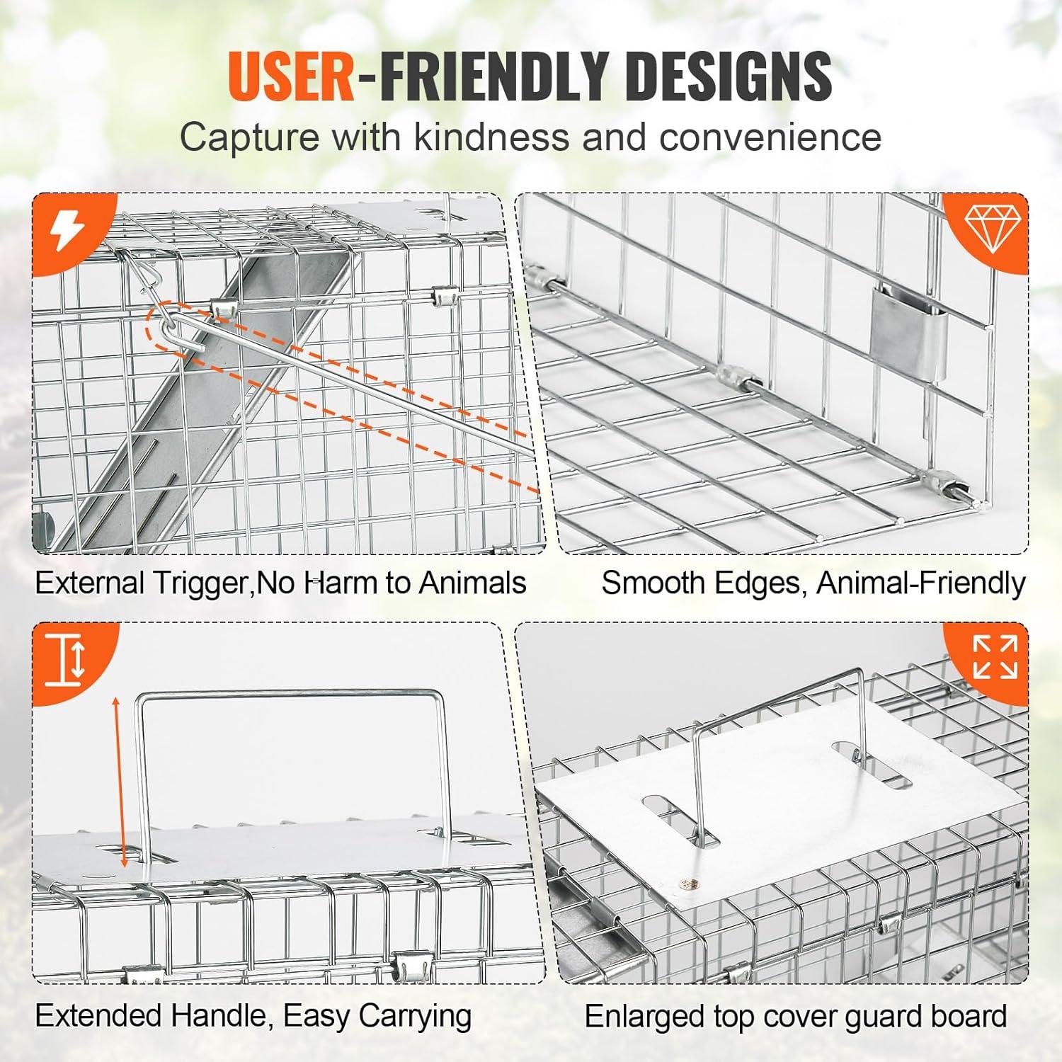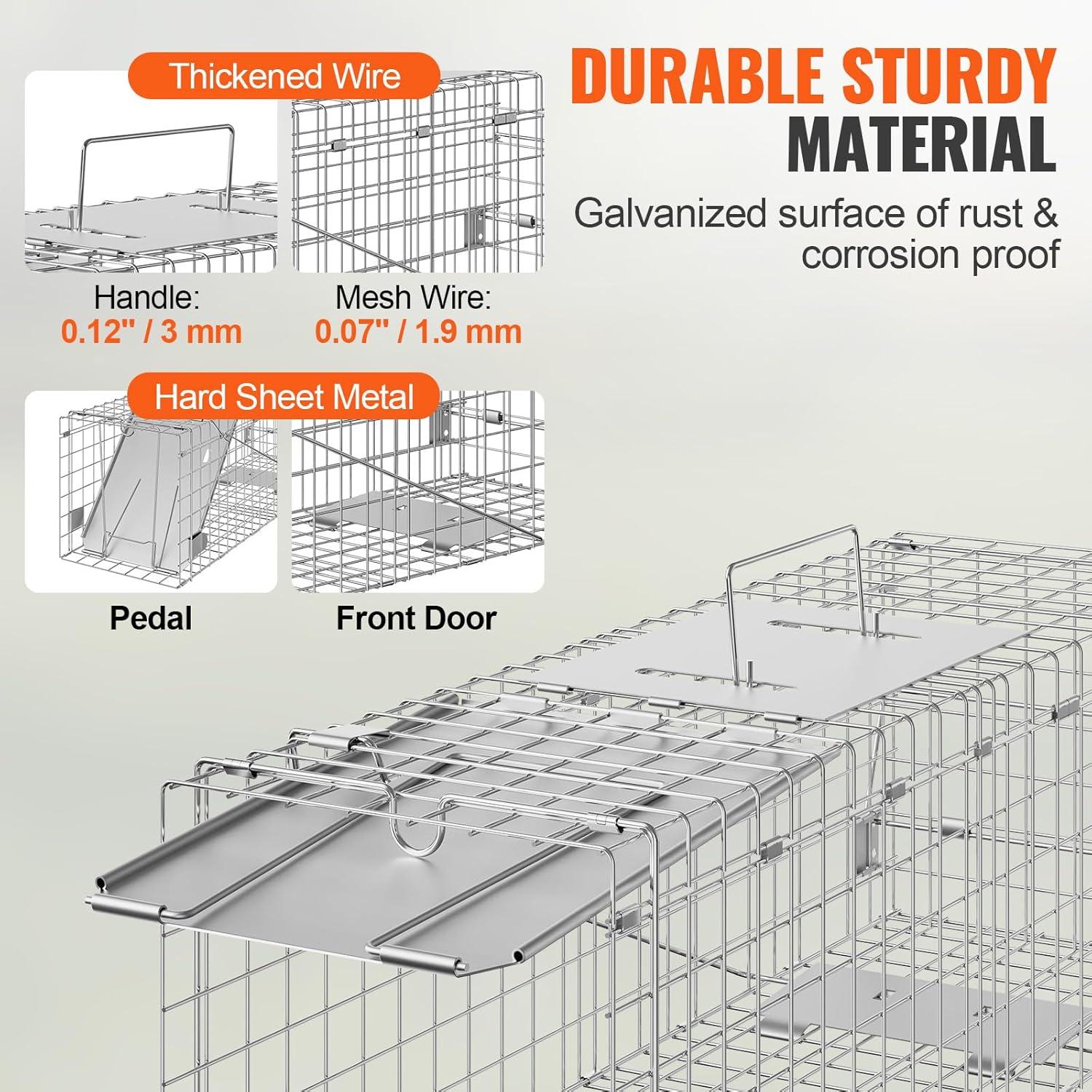 Sturdy and Durable: Our animal trap is built to last. It is constructed with sturdy, thickened wires that withstand animal bites and impacts without deformation or cracking. The galvanized coating provides excellent corrosion resistance, ensuring stability and durability in all weather conditions.