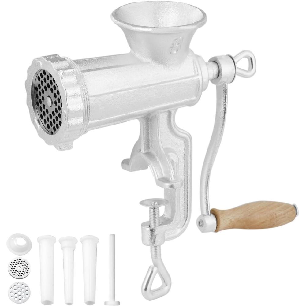 One Meat Grinder, Endless Uses: VEVOR multifunctional manual meat grinder allows for easy vegetables and meat grinding to make meatballs, sausages, and more. It also comes with 5mm and 8mm cutting plates, 1 cutting blade, 3 plastic sausage tubes, and 1 meat pusher, catering to the diverse needs of different culinary creations.