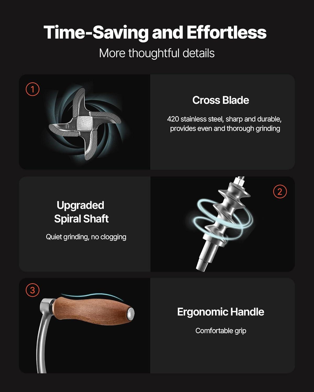Easy to Operate: This meat grinder is easy to install, and its detachable feature makes it easy to clean. Install the auger, blade, grinding plate, and nut in order, and then installation will be complete. There are also some specially-designed details to improve your experience. The ergonomic handle saves you time and energy in mincing food. The 3.35 inch / 8.5 cm enlarged arc-shaped inlet makes it convenient to add more meat. Stuff beyond the limits and create thick reach sausages.