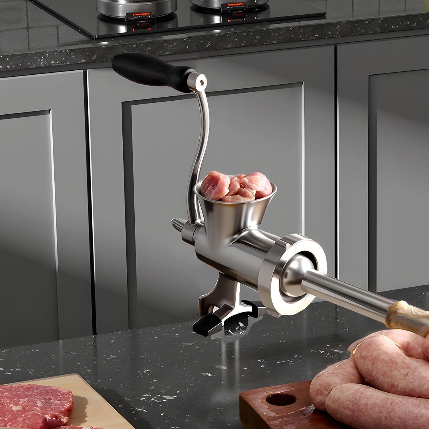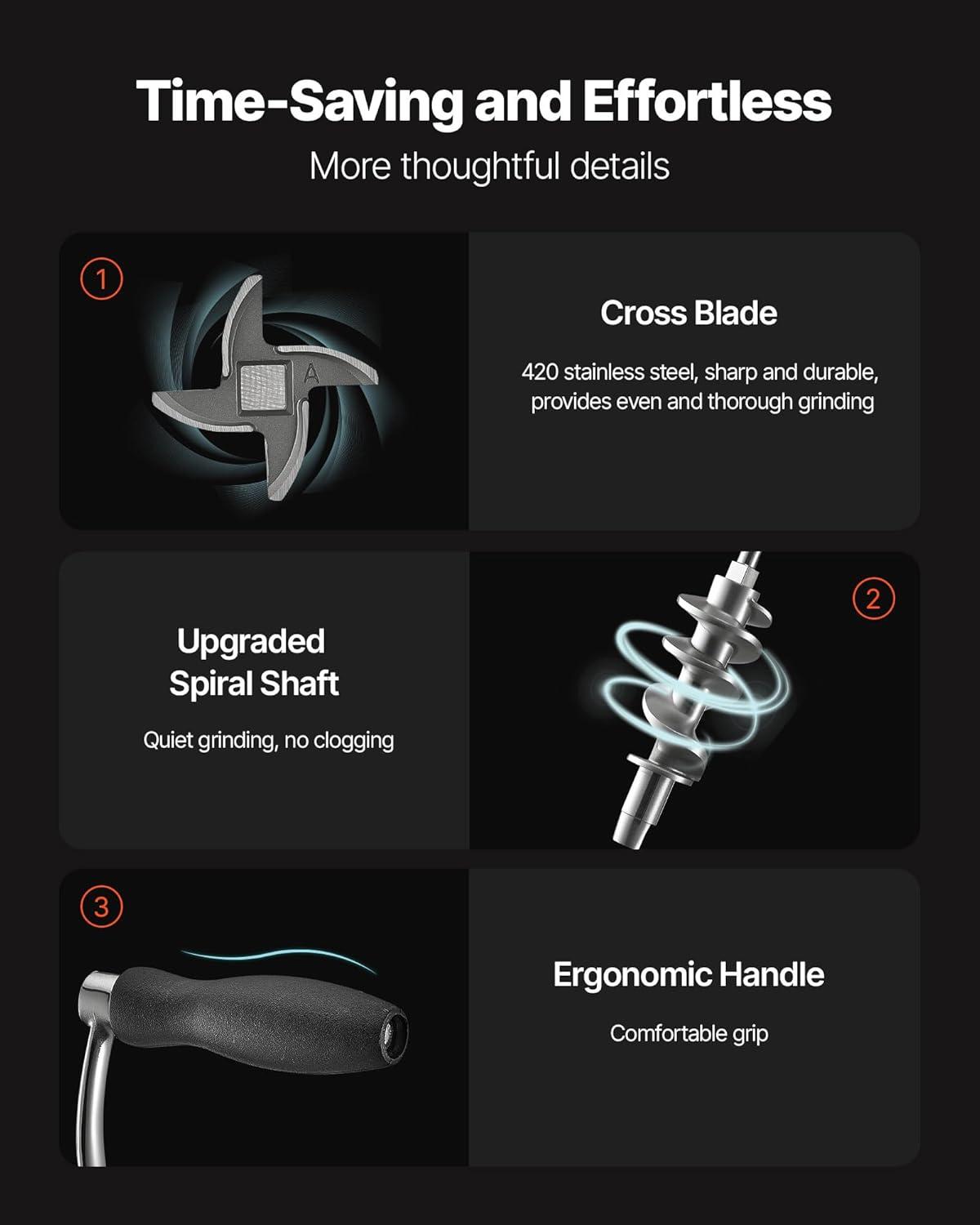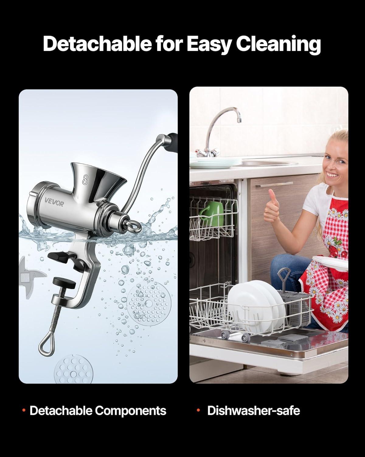 Food-Grade Stainless Steel: All parts of our manual meat grinder are made of food-grade stainless steel, which provides excellent rust and corrosion resistance and contributes to its stylish appearance. With this high-quality material, this machine offers you a healthy and secure method to ensure your food remains hygienic while cutting down maintenance costs.