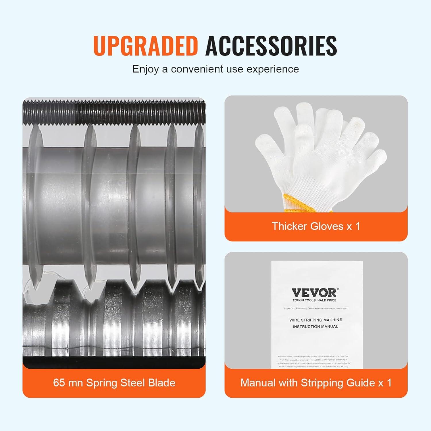 Complete Focus Is Yours: Get ready to be blown away! The VEVOR wire stripper machine has 4 stripping holes. Adjust the blade to fit all wires with a diameter from 0.06'' (1.5 mm) to 1.5'' (38 mm). It's that easy! Suitable for handling hard cover wires, soft cover wires, multi-conductor wires, mono-filament wires, etc. Are you ready?