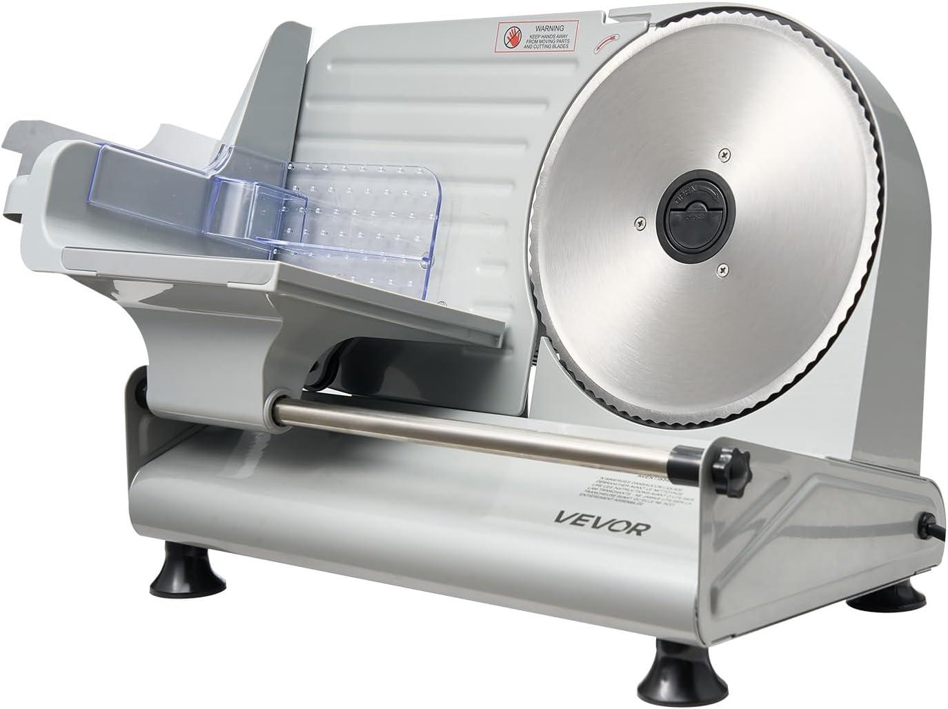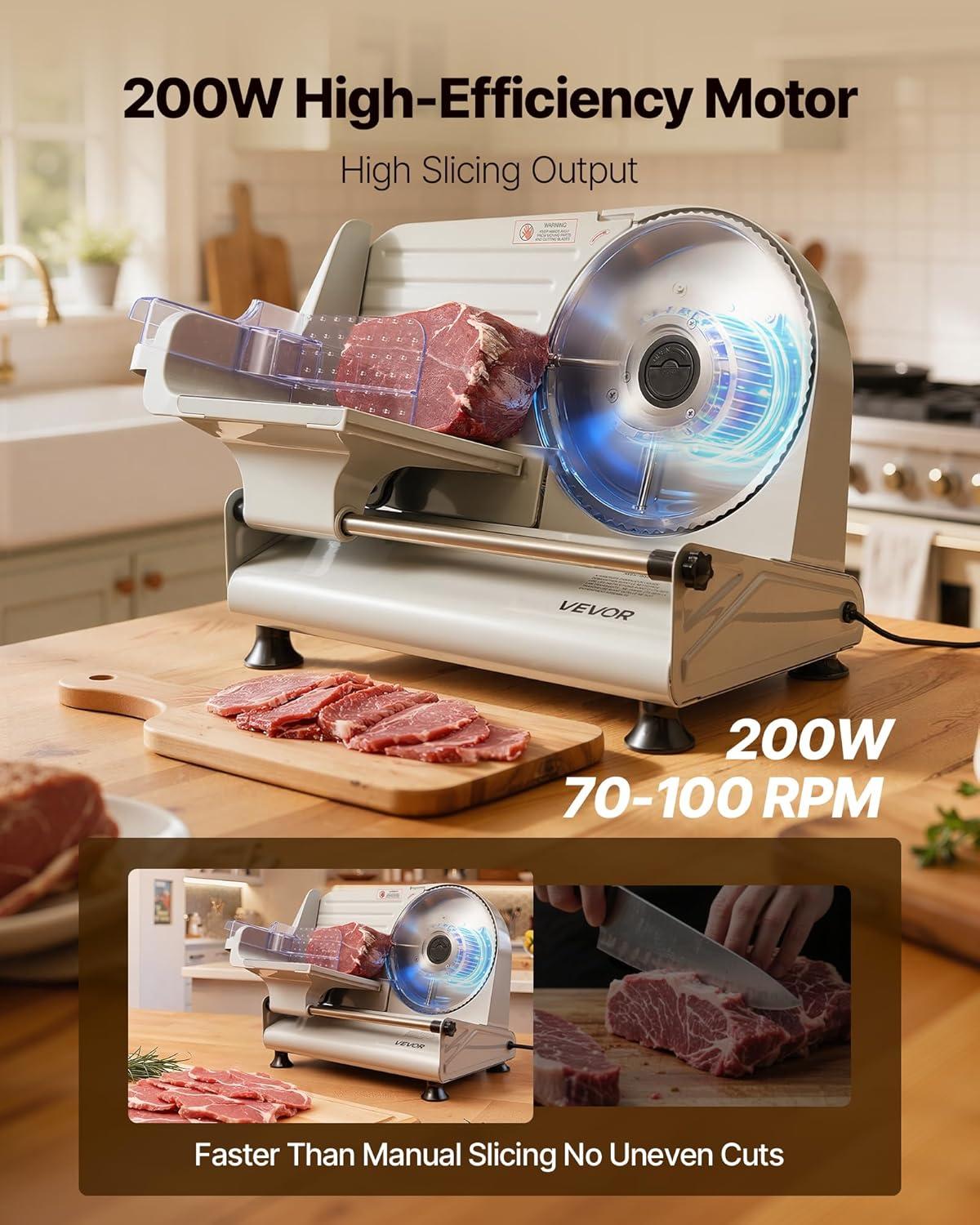 VEVOR Meat Slicer, 7.5 inch 200W Electric Deli Slicer Machine with SUS420 Blade, 0-0.6 inch Adjustable Thickness, ETL Certified Home Food-Slicer for Meat, Ham, Baguett, Steak(8.6 inch-200W)