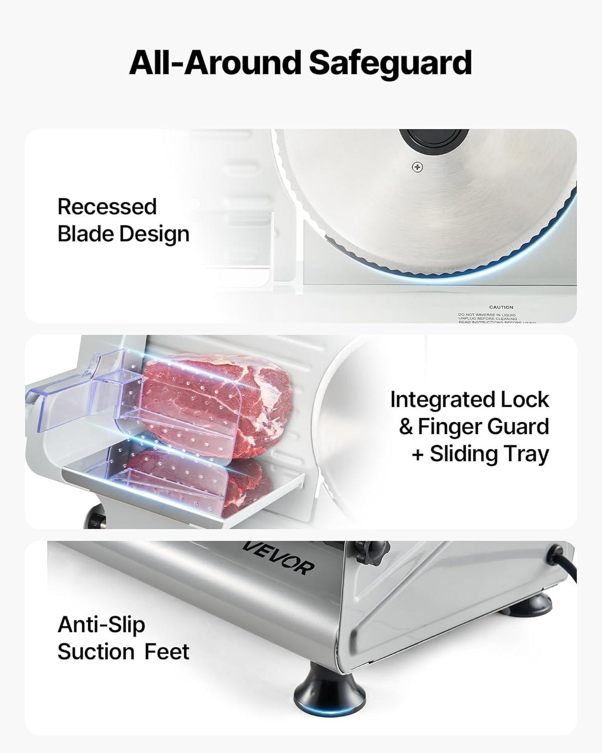 Comprehensive Security Features: The meat slicer machine’s housing stands 1 mm above the blade to avoid accidental contact. Equipped with a security lock, strong rubber suction feet, and a fixed knob plate, it ensures full-protection and secure operation