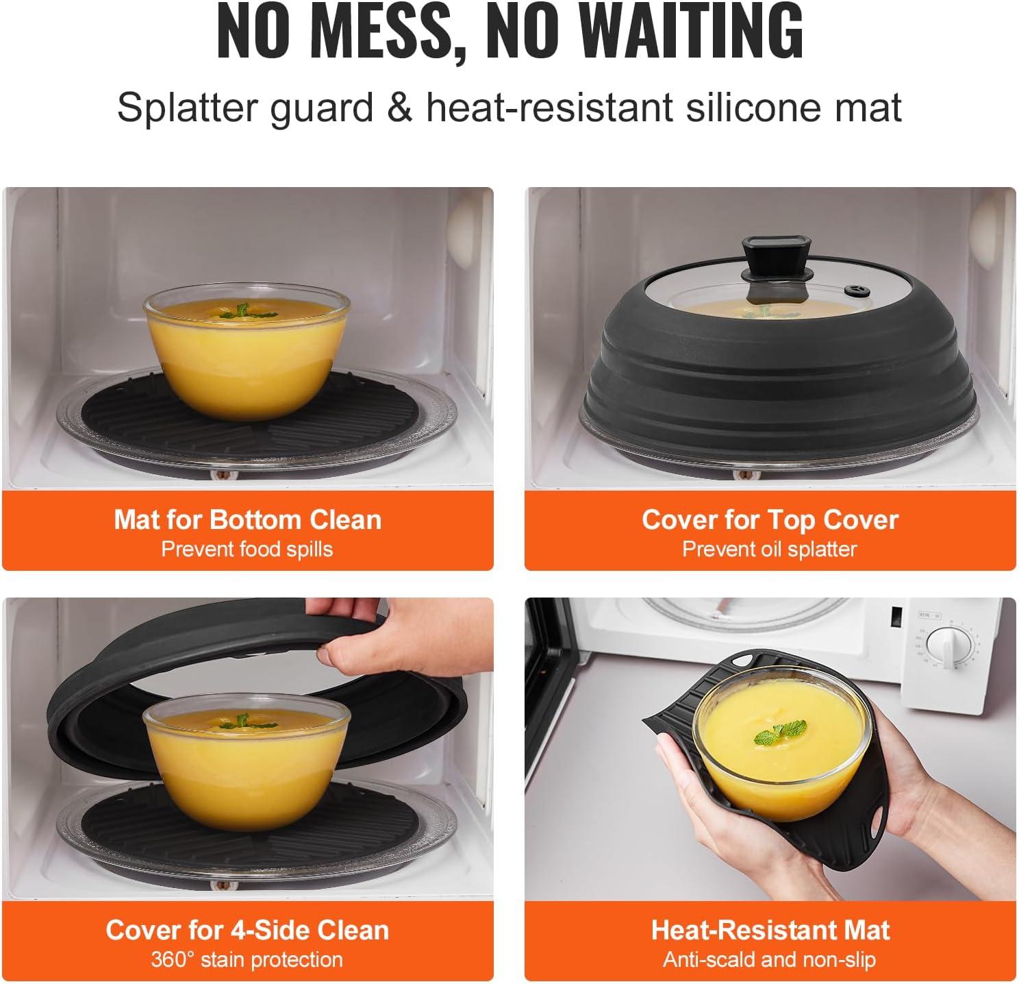 imageVEVOR Microwave Splatter Cover ampamp Mat 108quot Collapsible Microwave Lid for Food 500F HeatResistant Silicone ampamp Tempered Glass Splatter Guard for Plate Dish MultiPurpose Kitchen Gadget with Handle2 Pack