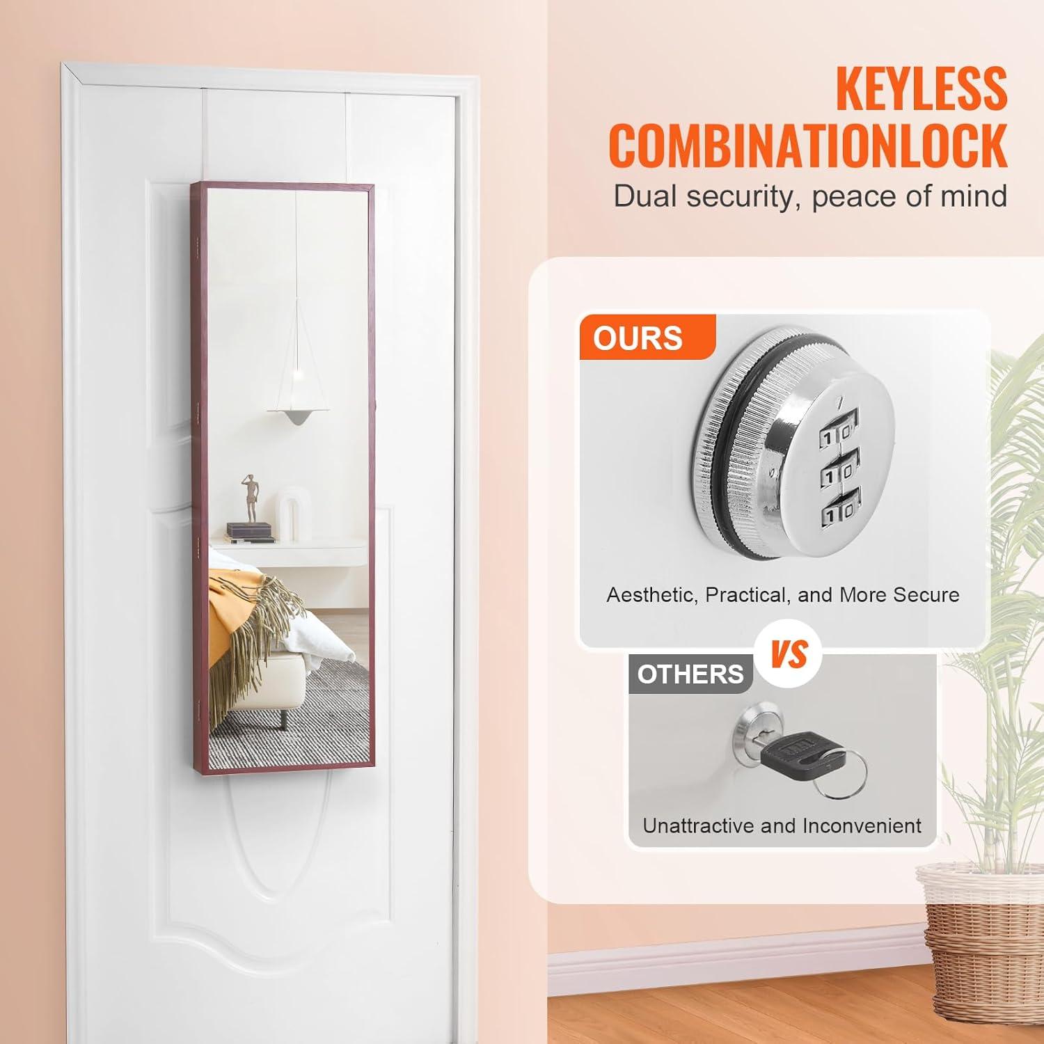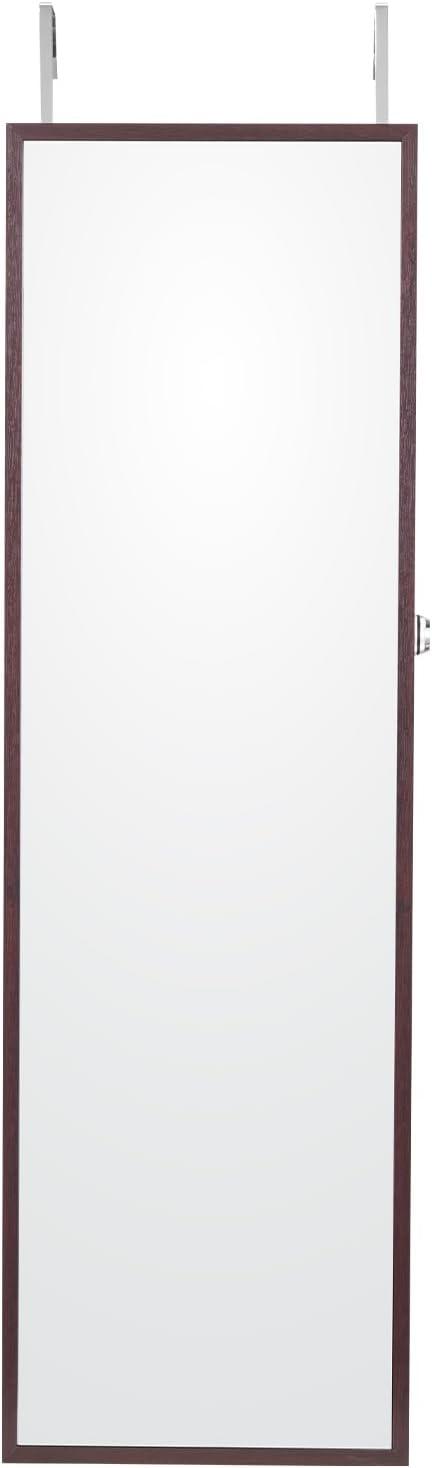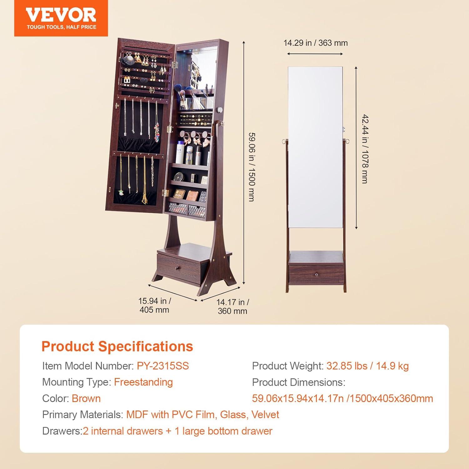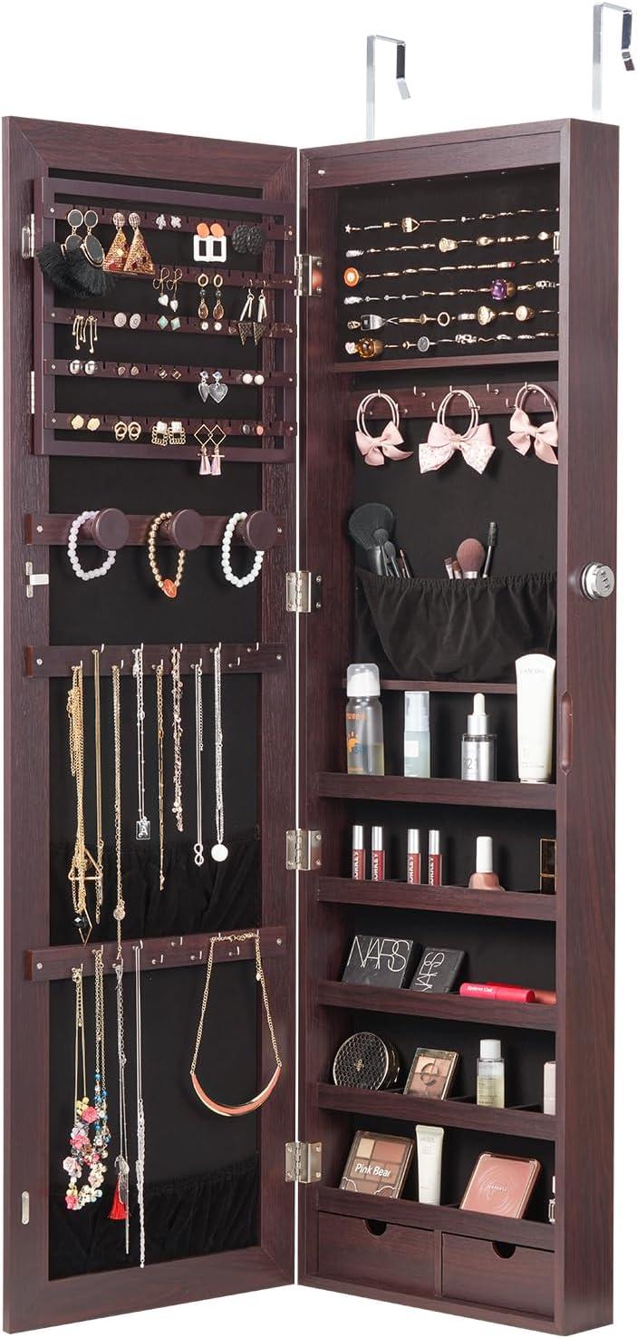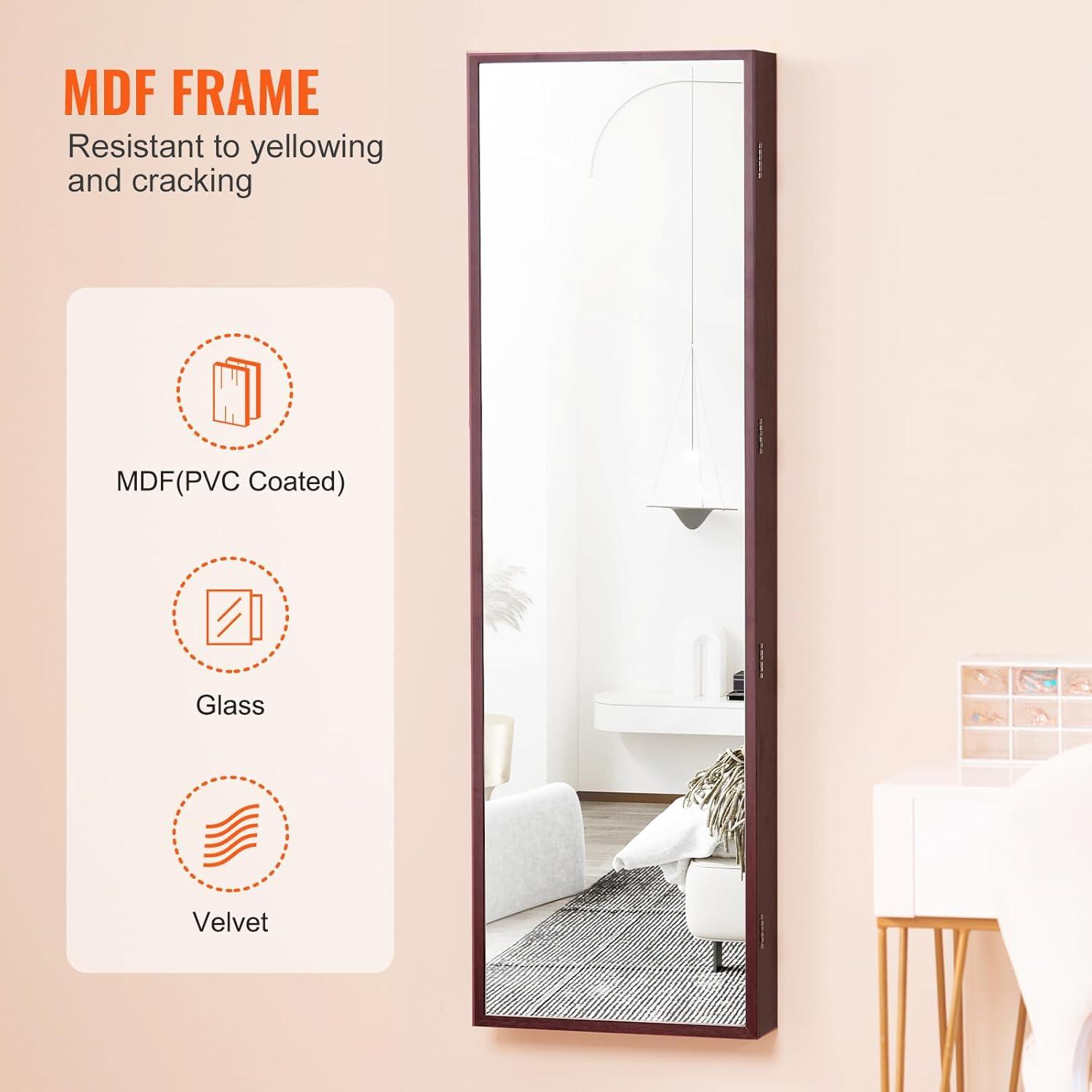 VEVOR Mirror Jewelry Cabinet, 47.2-Inch Tall Lockable Jewelry Armoire with Full-Length Mirror, Wall/Door Mounted Organizer with LED Lights and Velvet Lining, Brown(Brown)