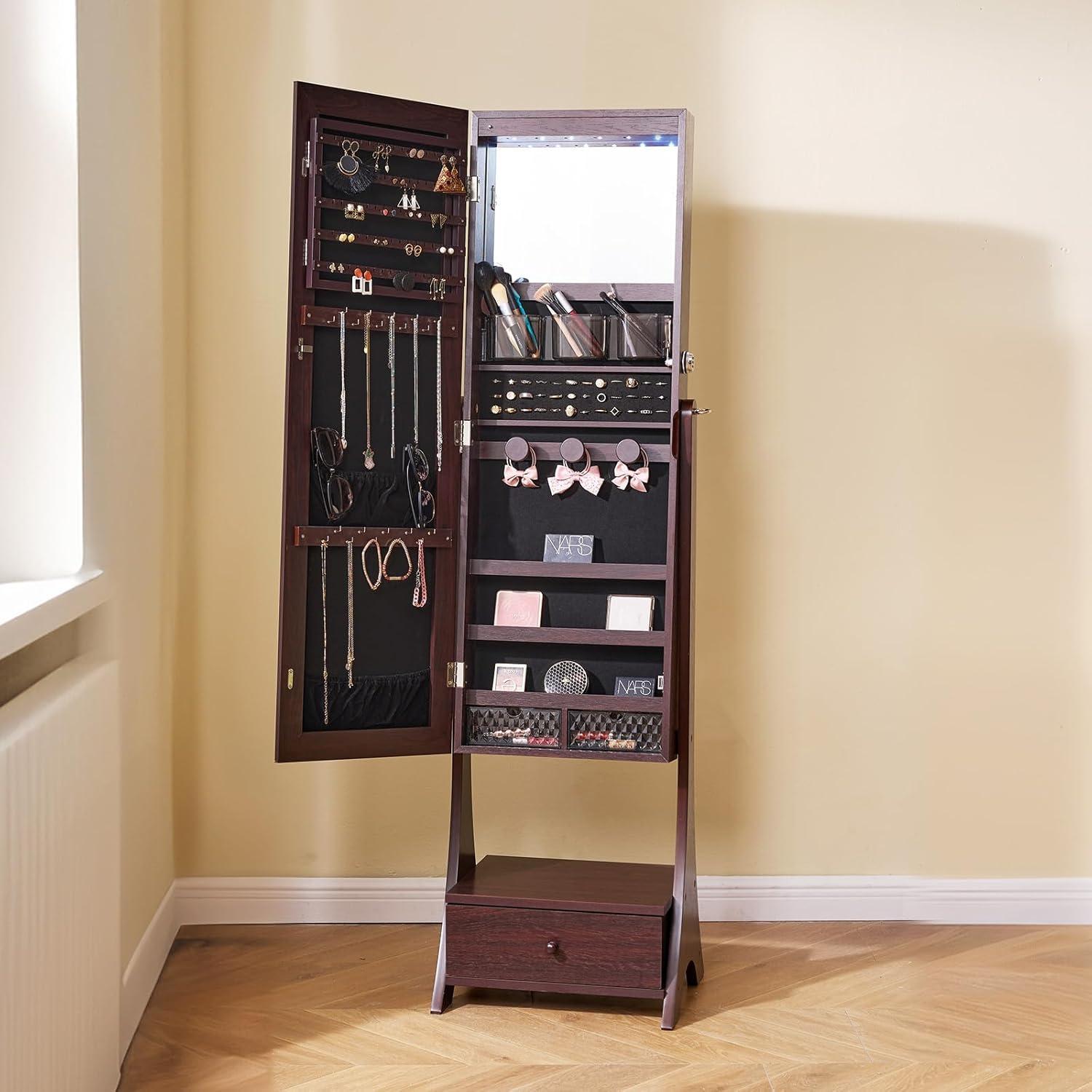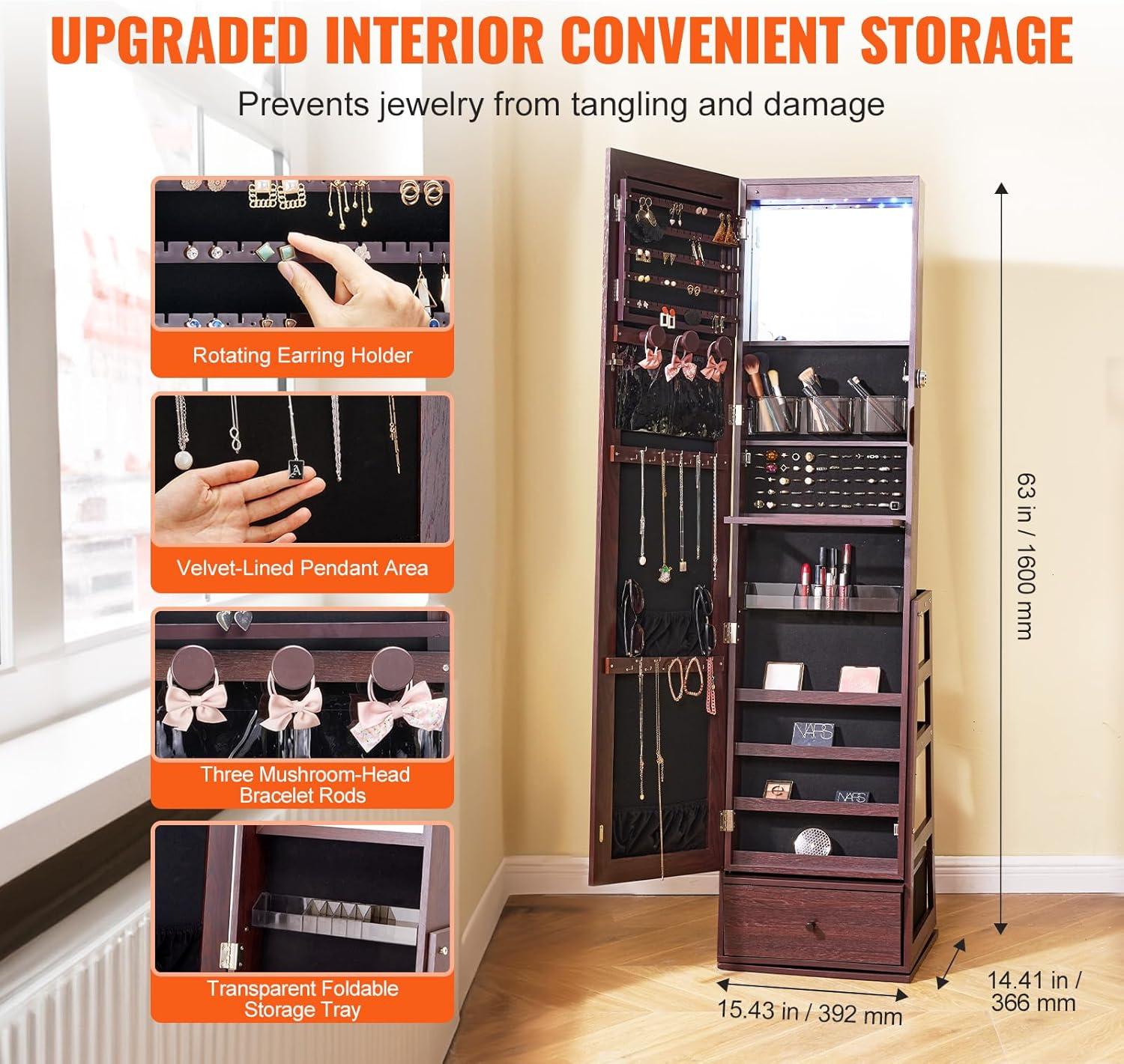 2-in-1 Functionality: The VEVOR mirror jewelry cabinet is not only a jewelry organizer but also a full-length mirror, providing a head-to-toe view of your outfit. The mirror's full-screen design is stylish and elegant, perfect for checking your jewelry and makeup before heading out or attending events.