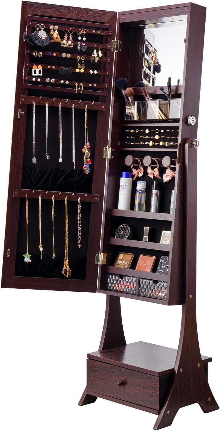 Secure Protection: This jewelry cabinet armoire with mirror comes with a keyless password lock design, eliminating the risk of losing keys while protecting your valuables from damage by children. The velvet lining in the hanging area prevents your jewelry from getting scratched.