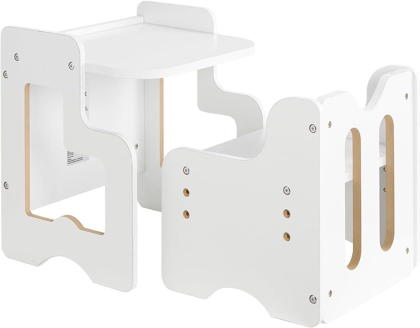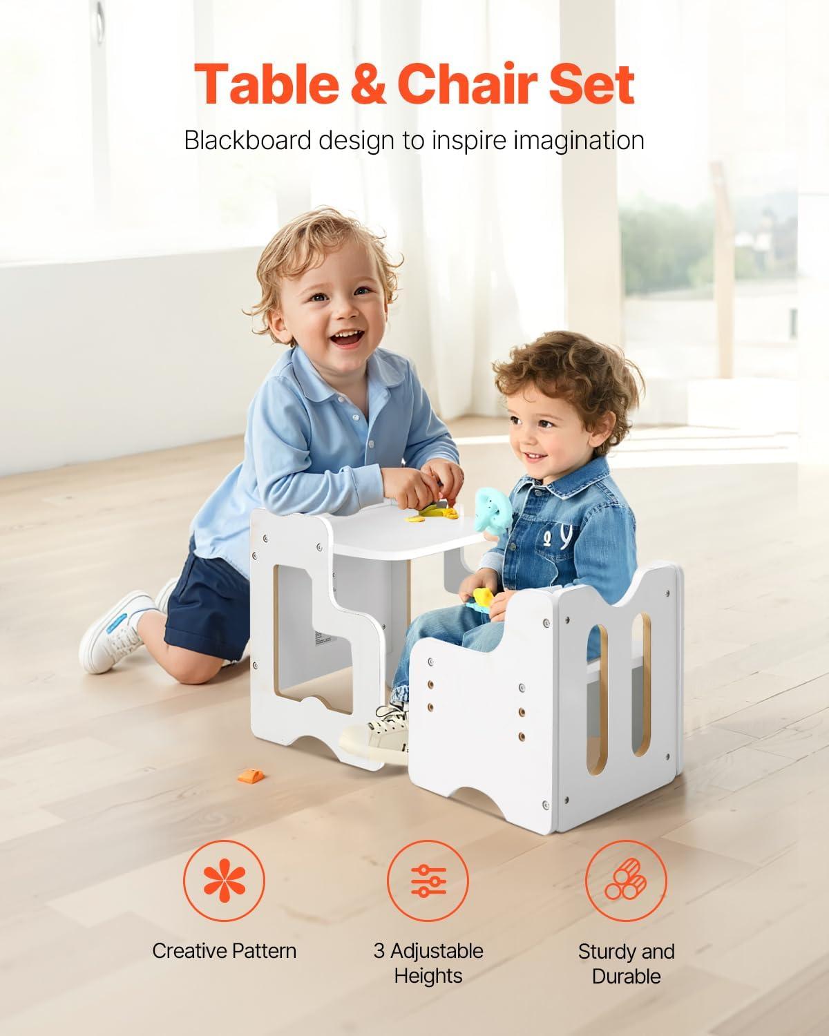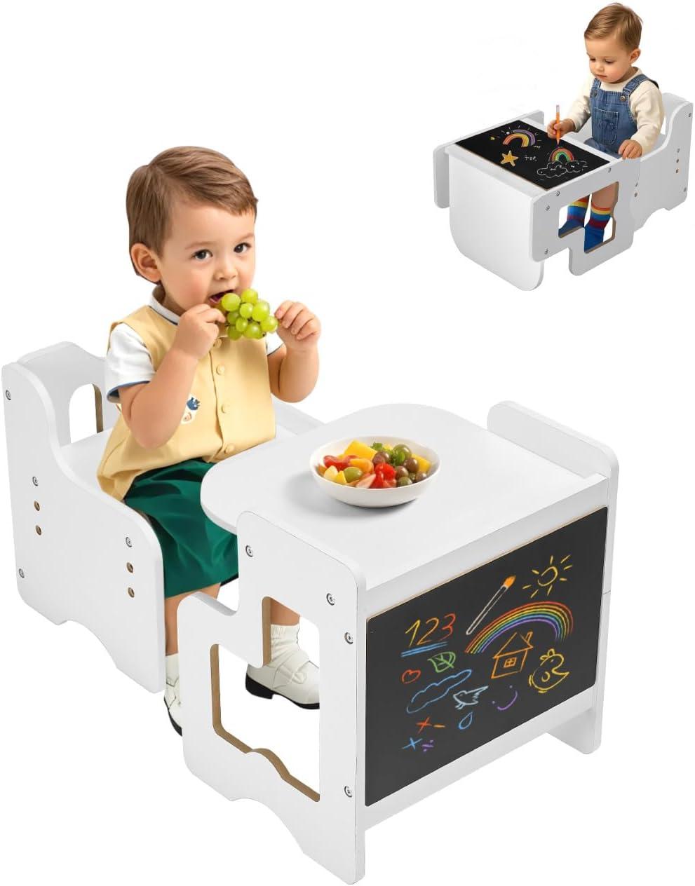 This weaning table and chair set has a chalkboard surface and 3 adjustable heights (5.2 in, 6.6 in, 8 in). Made from sturdy MDF with rounded edges. It quickly transforms into a chalkboard and can be used as a footrest or toddler chair.