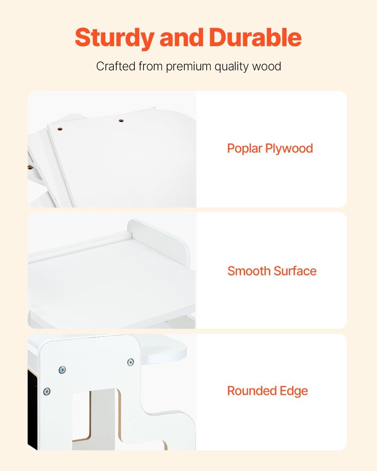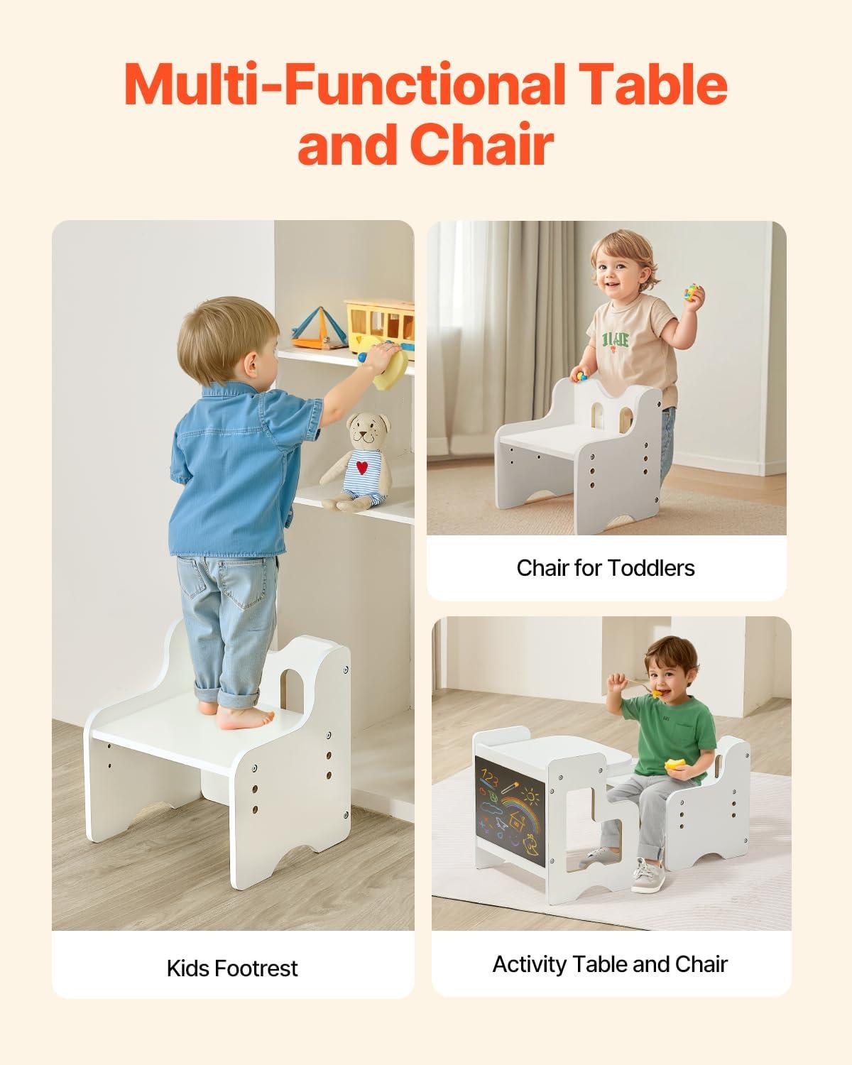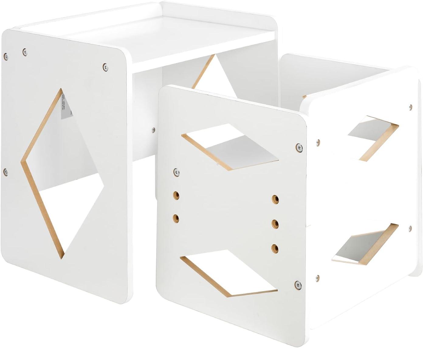 This weaning table and chair set has a chalkboard surface and 3 adjustable heights (5.2 in, 6.6 in, 8 in). Made from sturdy MDF with rounded edges. It quickly transforms into a chalkboard and can be used as a footrest or toddler chair.