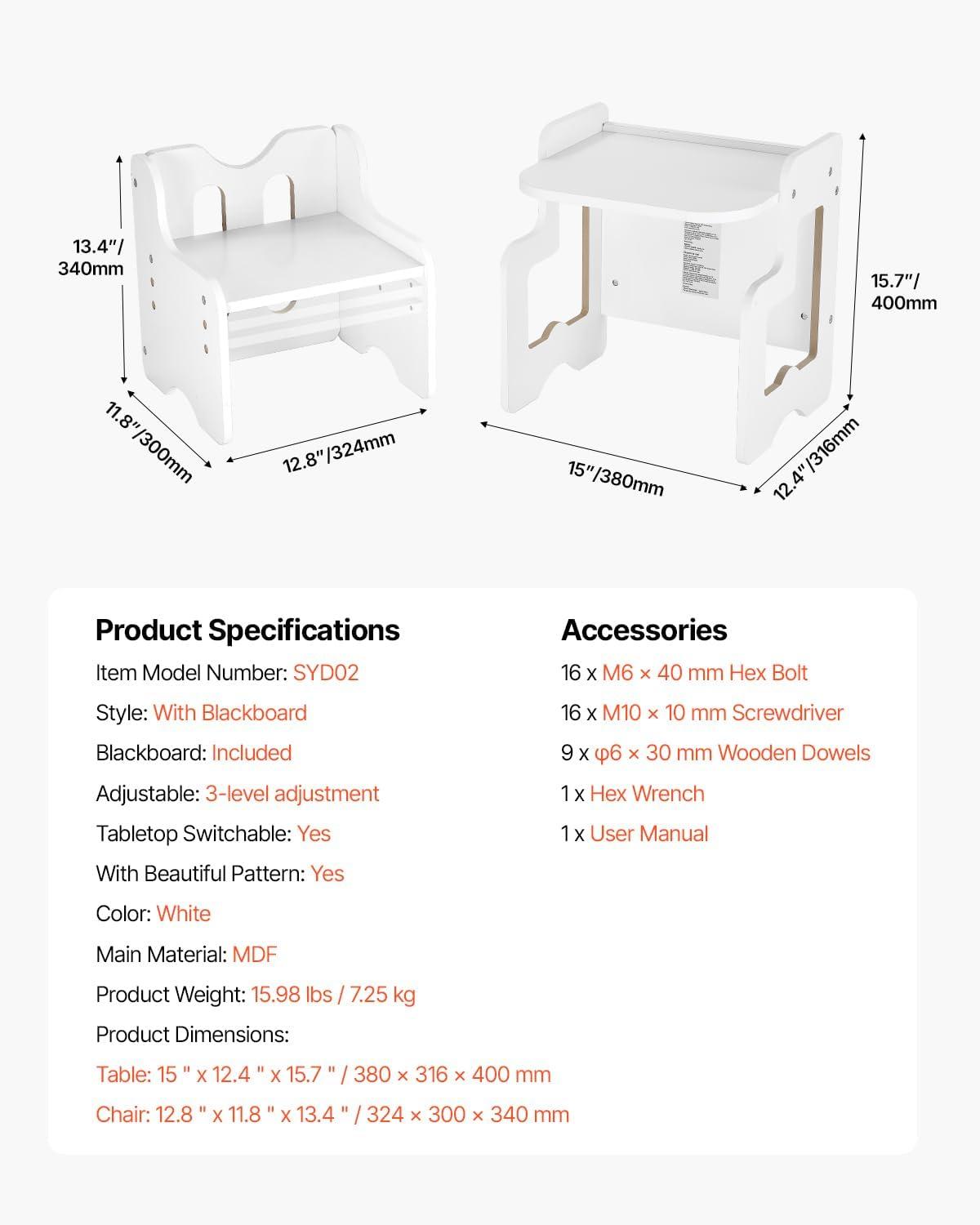 Weaning Table and Chair Set: This children's weaning table and chair set includes a table measuring 15 x 12.4 x 15.7 in (380 x 316 x 400 mm) and a chair measuring 12.8 x 11.8 x 13.4 in (324 x 300 x 340 mm). Designed to foster independence and inspire creativity, this set combines practical multi-functionality with an imaginative chalkboard surface, allowing kids to fully express themselves during meals, learning, or drawing.