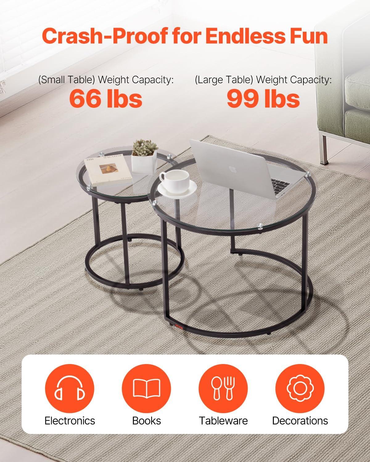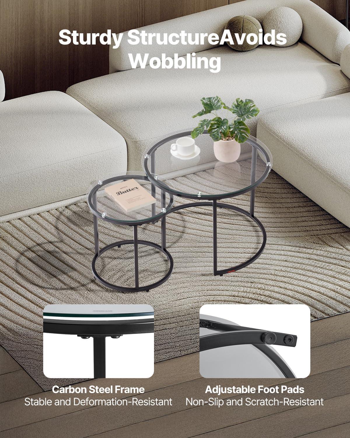 Stable and Durable: Our round nesting coffee table has a sturdy carbon steel frame, which can withstand everyday pressures and maintain its integrity over time. The adjustable foot pads let you quickly deal with uneven floors, ensuring the table stays stable and wobble-free