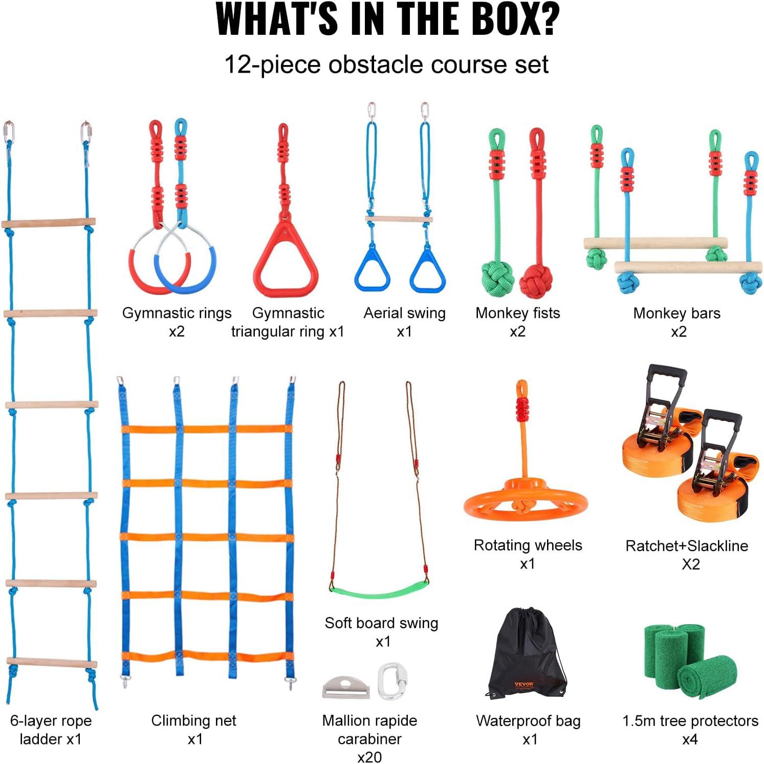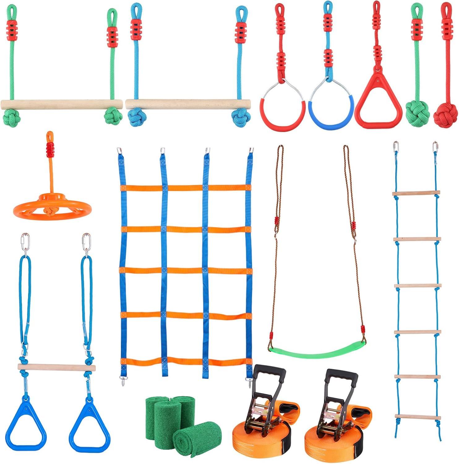 Abundant Accessories: The ninja warrior obstacle course includes: 2×65-foot slacklines, 4 tree protectors, 1 climbing net, 1 climbing ladder, 2 gymnastic rings, 2 monkey bars, 2 monkey fists, and 1 swing. The diverse accessories are perfect for training different strengths in children. This product also comes with a storage bag for your convenience during picnics.