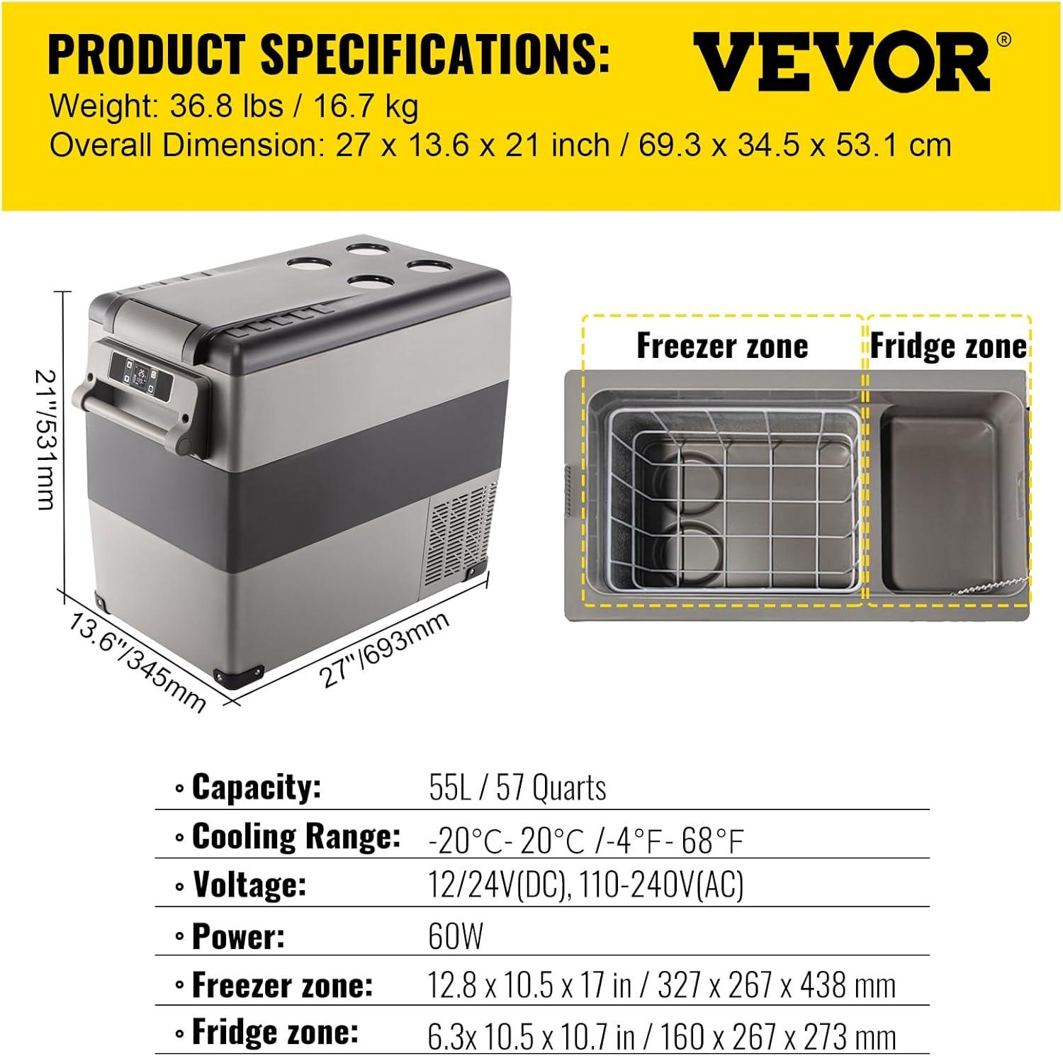 imageVEVOR NLS45 12 Volt Car Refrigerator Fridge 32 L Dual Zone Portable Freezer 468 Adjustable Range 1224V DC and 100240V AC Compressor Cooler for Outdoor Camping RV Bule and greySingle Zone 58QT