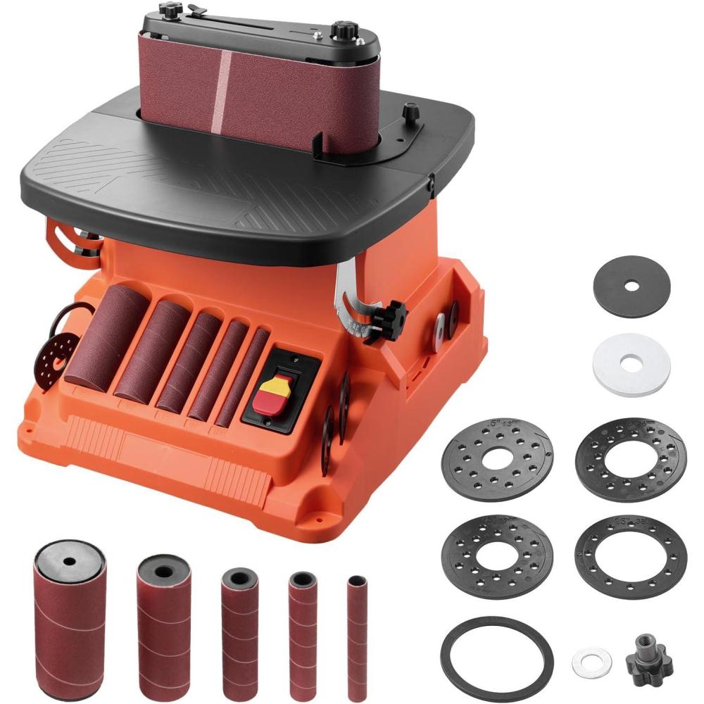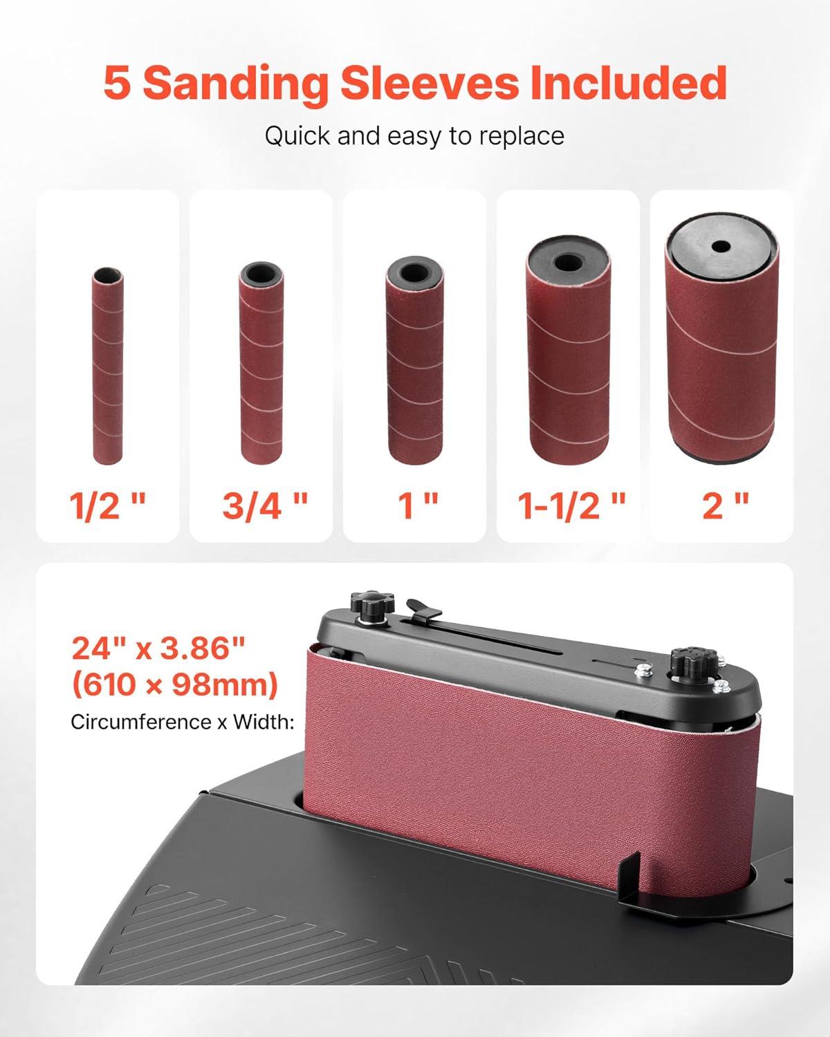 6 Sanding Sleeve Sizes: Equipped with 6 sanding sleeves (1/2″, 3/4″, 1″, 1-1/2″, 2″, 3″) and 6 table inserts, suitable for different workpiece sizes and curves. Quick replacement makes sanding more flexible and efficient
