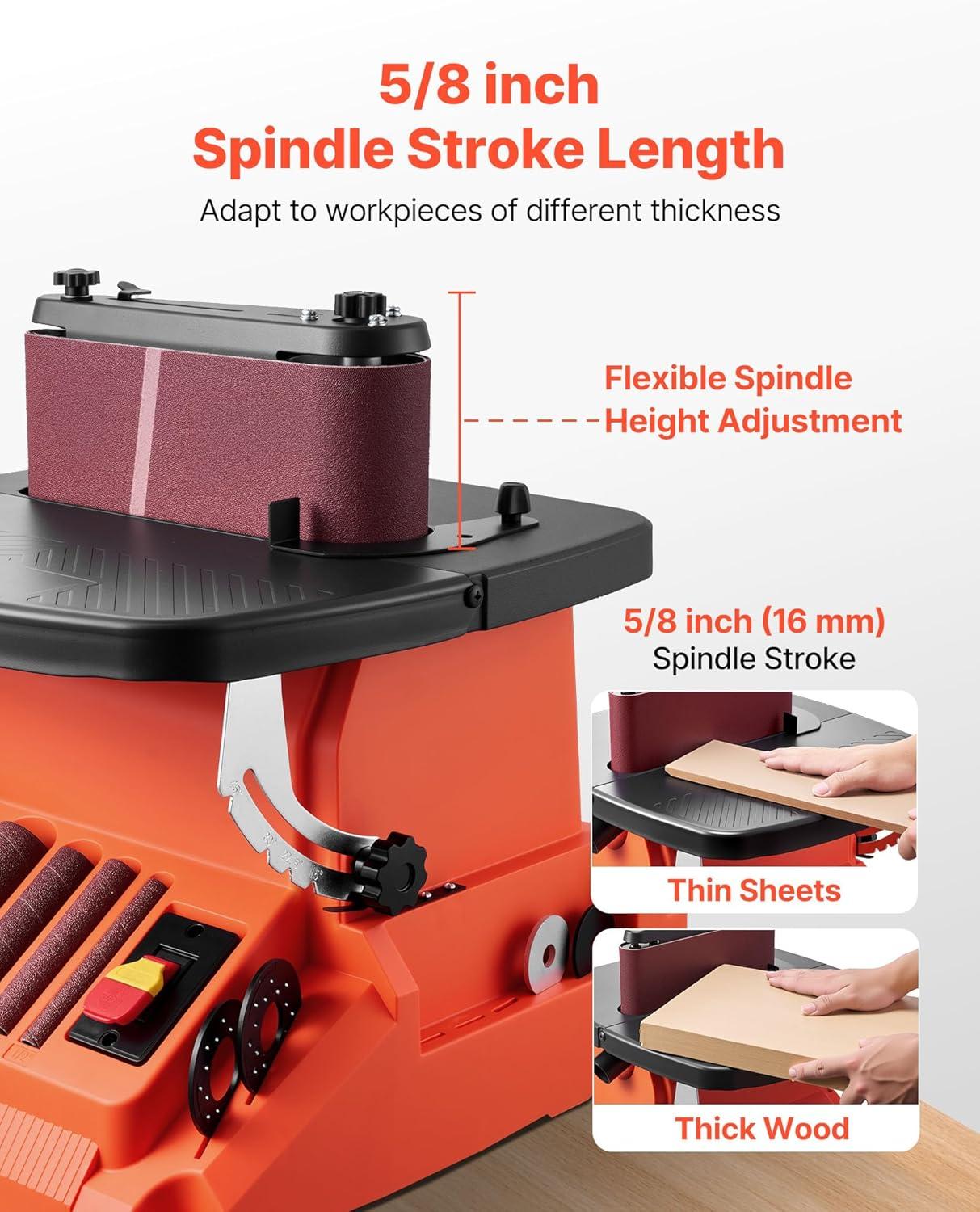 Spacious Worktable: This benchtop spindle sander features a 5/8-inch (16mm) stroke length to adapt to thin and thick workpieces, paired with a 15.4 x 16.3-inch wide cast iron worktable that offers spacious workspace and stable support