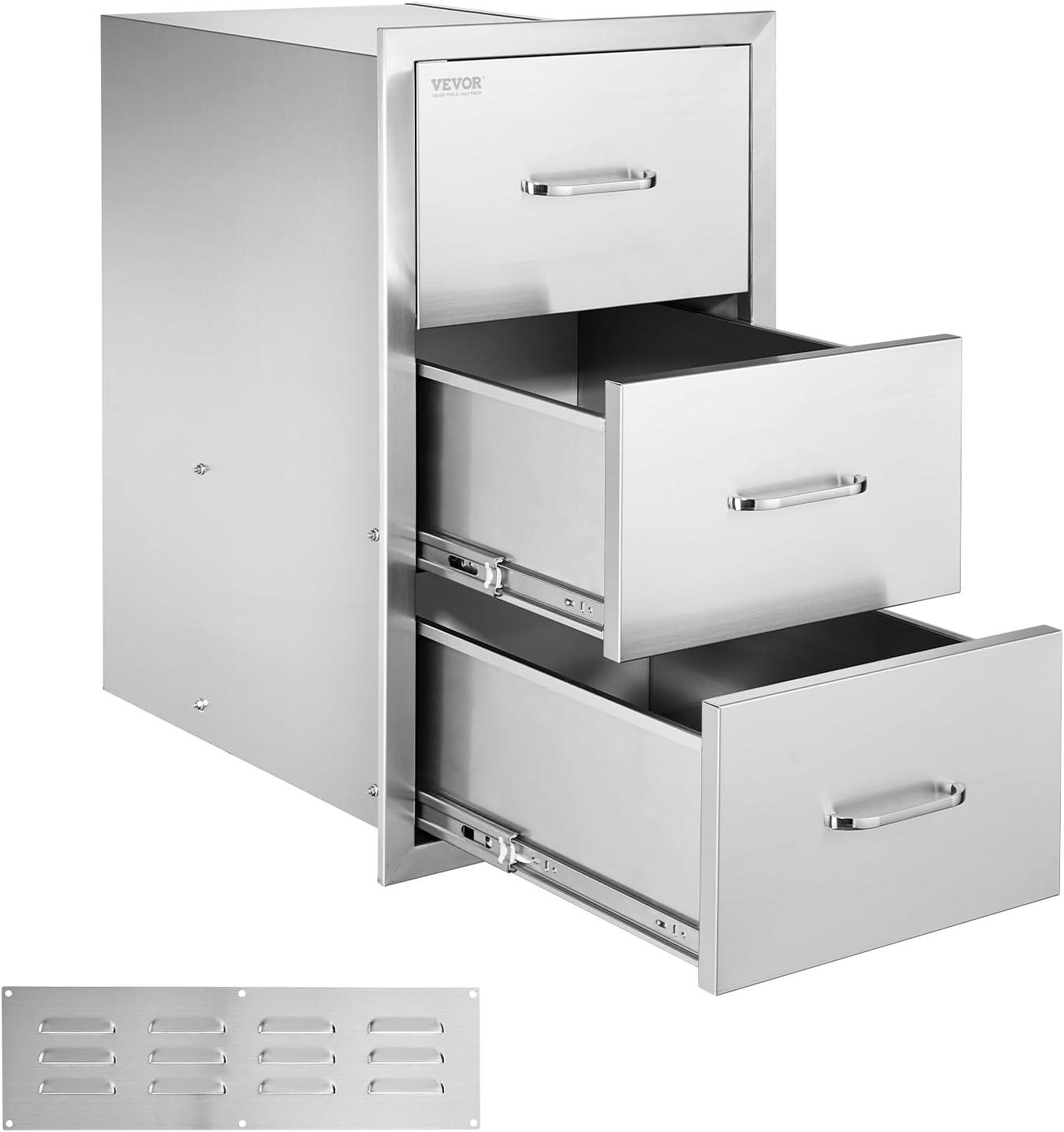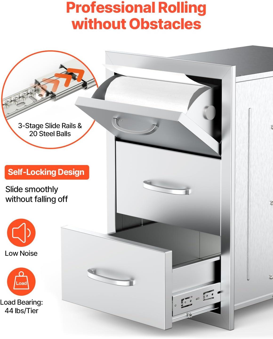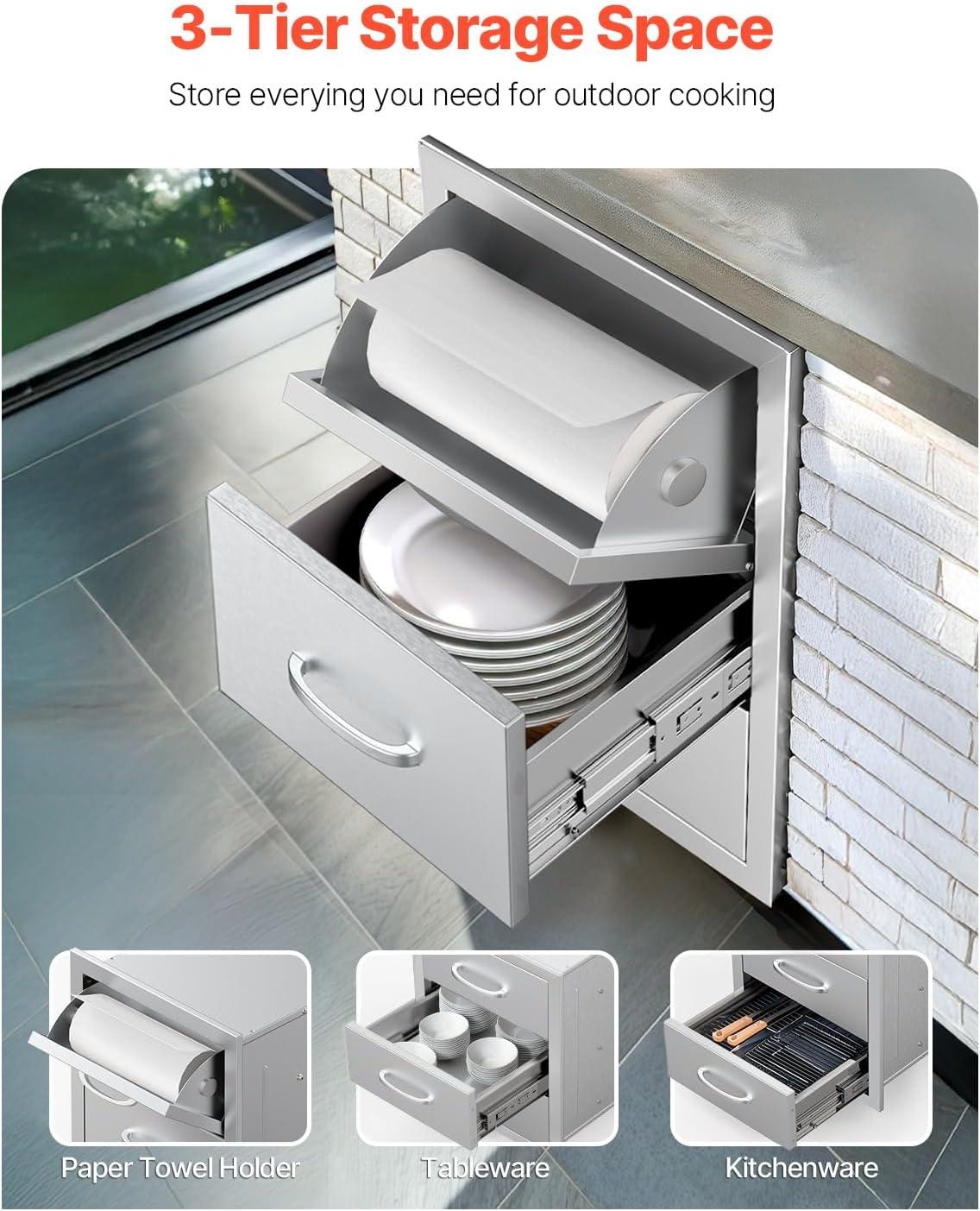 VEVOR Outdoor Kitchen Drawers, 16.5"W x 29"H x 20.5"D Triple Access Drawers, Stainless Steel Flush Mount Cabinets, BBQ Island Drawers Storage with Paper Towel Holder & Handle, for Patio Grill Station