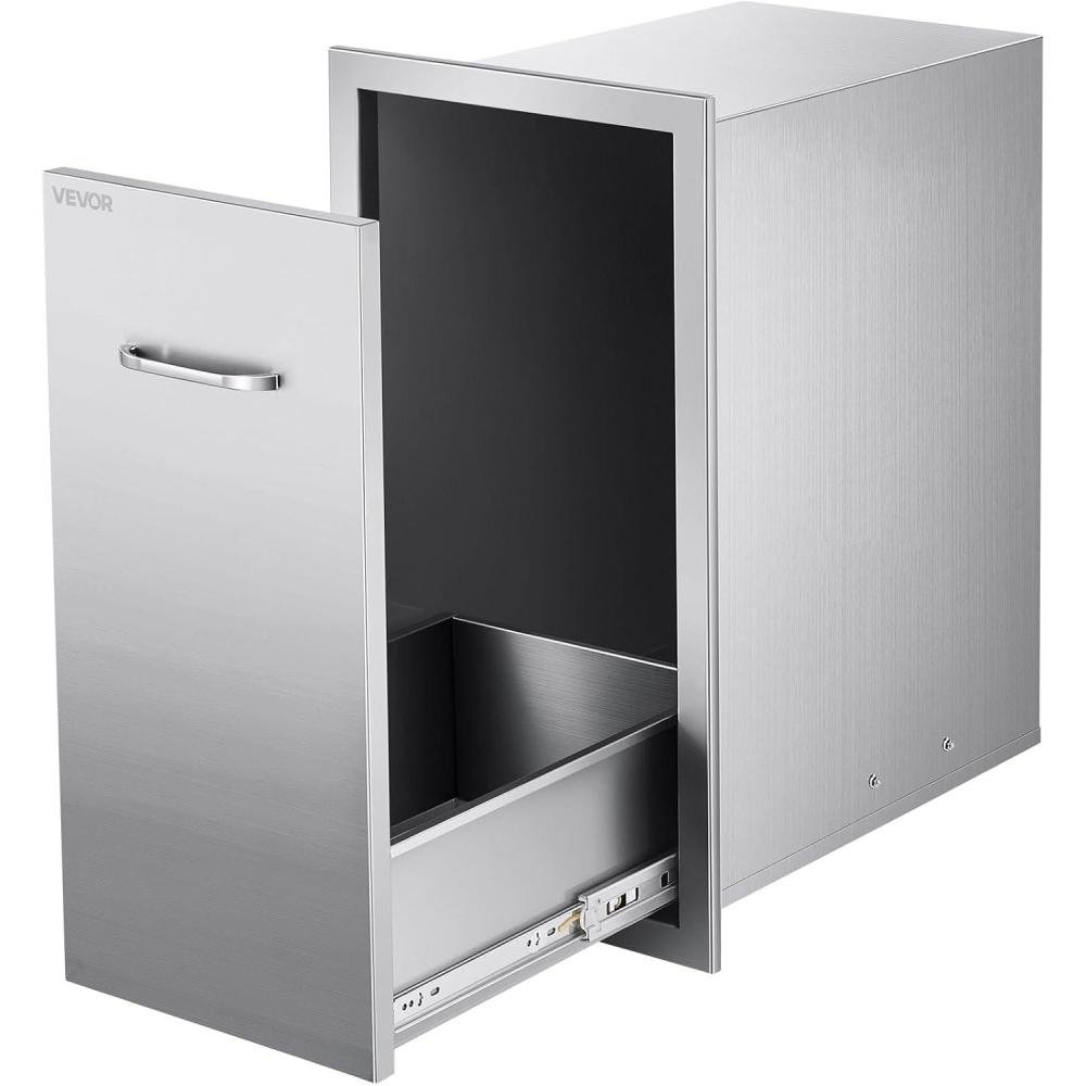 Premium Stainless Steel Material: Our outdoor kitchen trash cabinet is made of waterproof stainless steel that resists high temperatures. The smooth, brushed finish looks great and allows oil stains to be easily wiped clean for simple maintenance