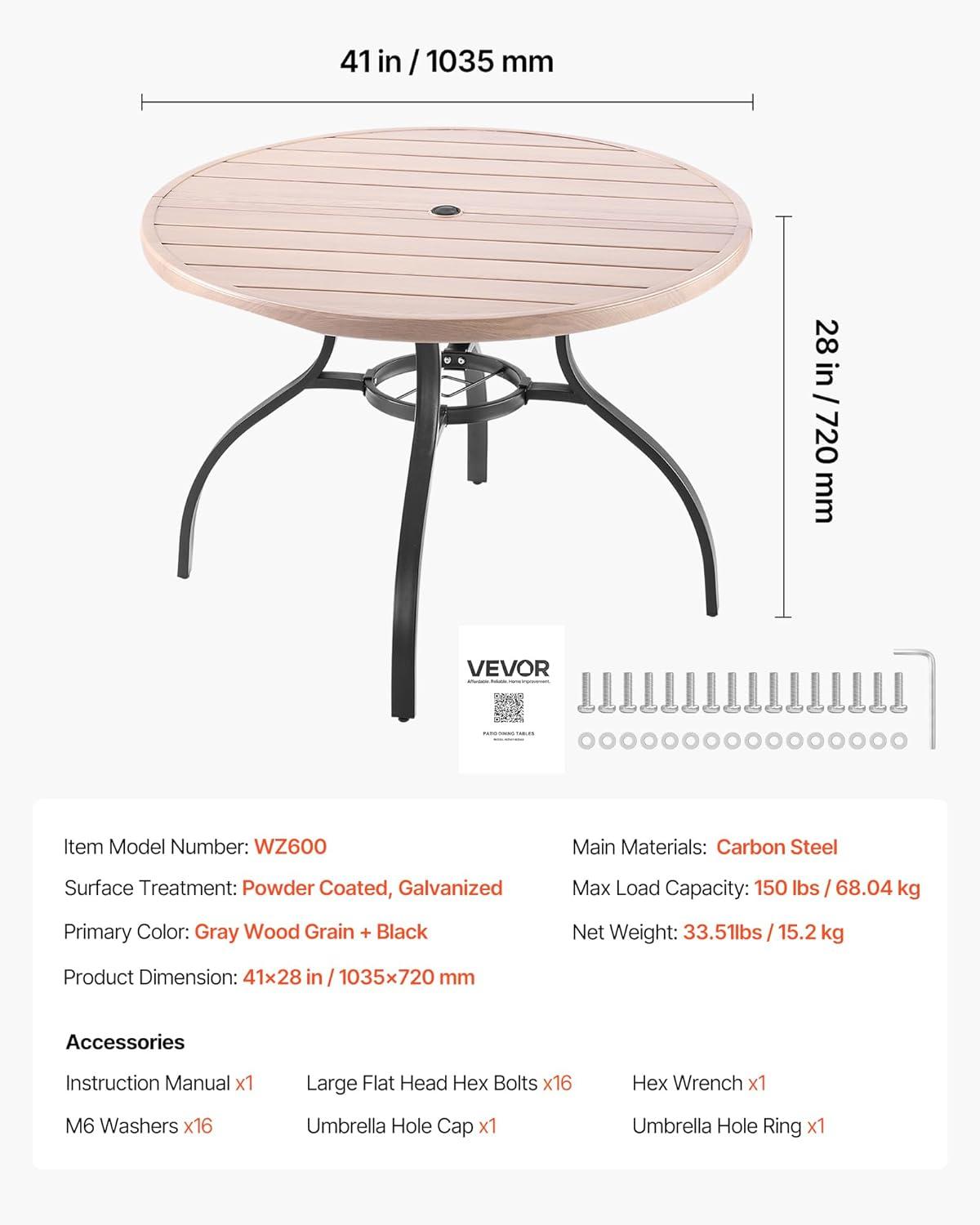 VEVOR Outdoor Patio Dining Table, 41 inch Round Wood-Like Steel Slat Backyard Bistro Coffee Tables for 4, with 1.5 in Umbrella Hole, Outside All-Weather Large Furniture for Lawn Garden Porch(41 inch)