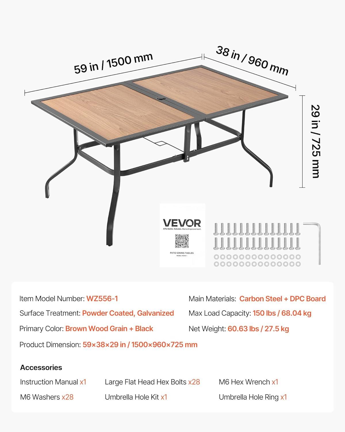 Seats 4–6 People: This patio dining table features a 59×38 in (1505×960 mm) tabletop, large enough for family meals or small gatherings. The table comes with easy-to-follow assembly instructions and all necessary hardware, making setup a breeze