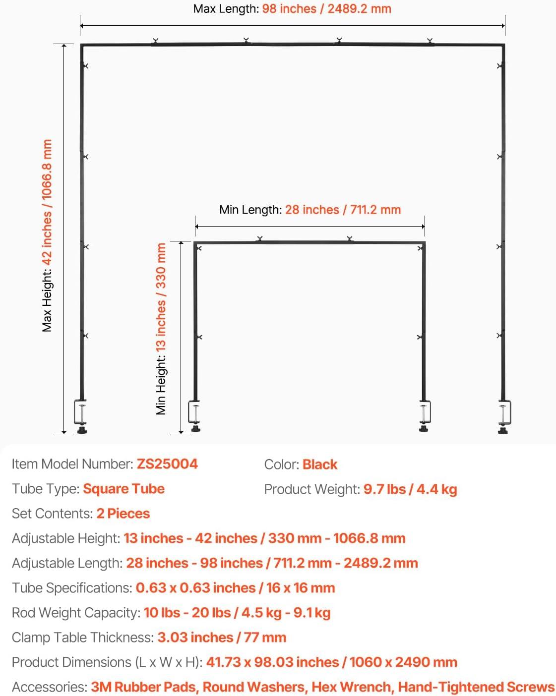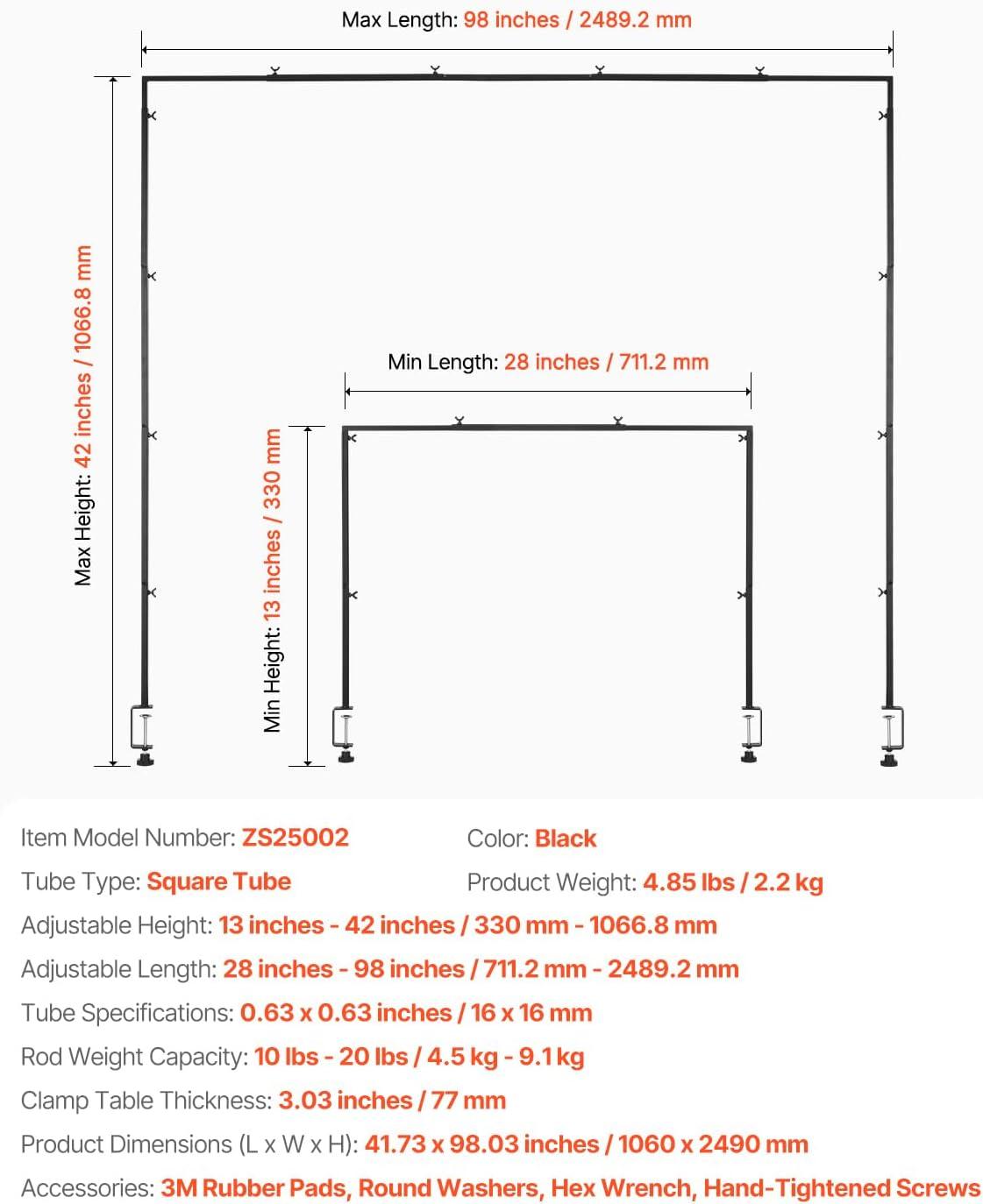 Sturdy Weight-Bearing Design: Built with square metal tubes and 3.03 in / 77 mm C-clamps, this over the table rod stand offers 10-20 lbs (4.5 kg – 9.1 kg) load capacity, making it more durable and stable than ordinary thin round pipes. The rust-resistant powder-coated surface withstands outdoor weather.