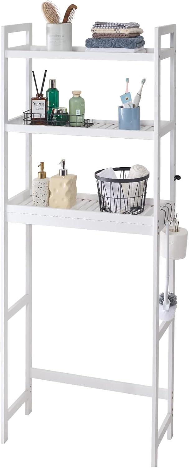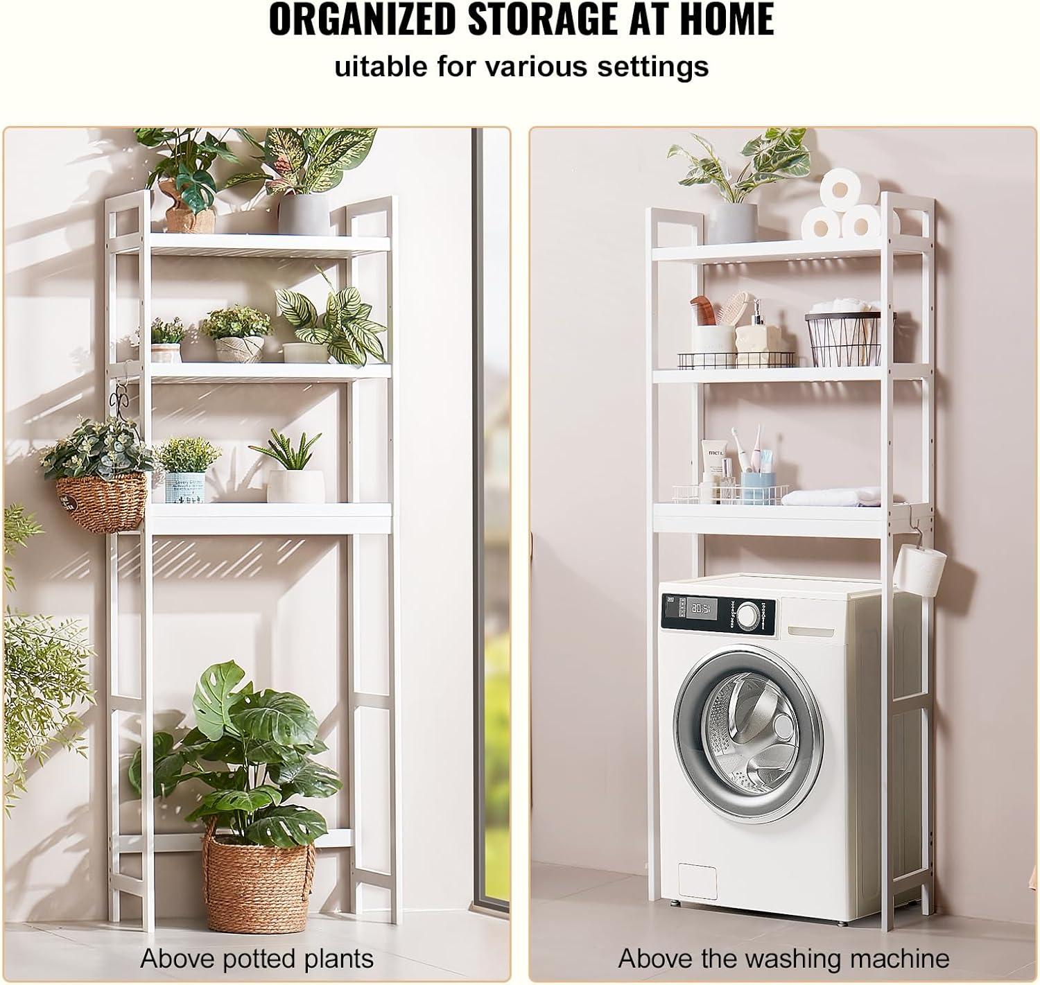 VEVOR Over The Toilet Storage, 3-Tier Adjustable Over Toilet Bathroom Organizer, Bamboo Storage Shelf Rack with 3 Hooks, Freestanding Easy Assembly Laundry Space Saver, Fit Most Toilets, White(White)