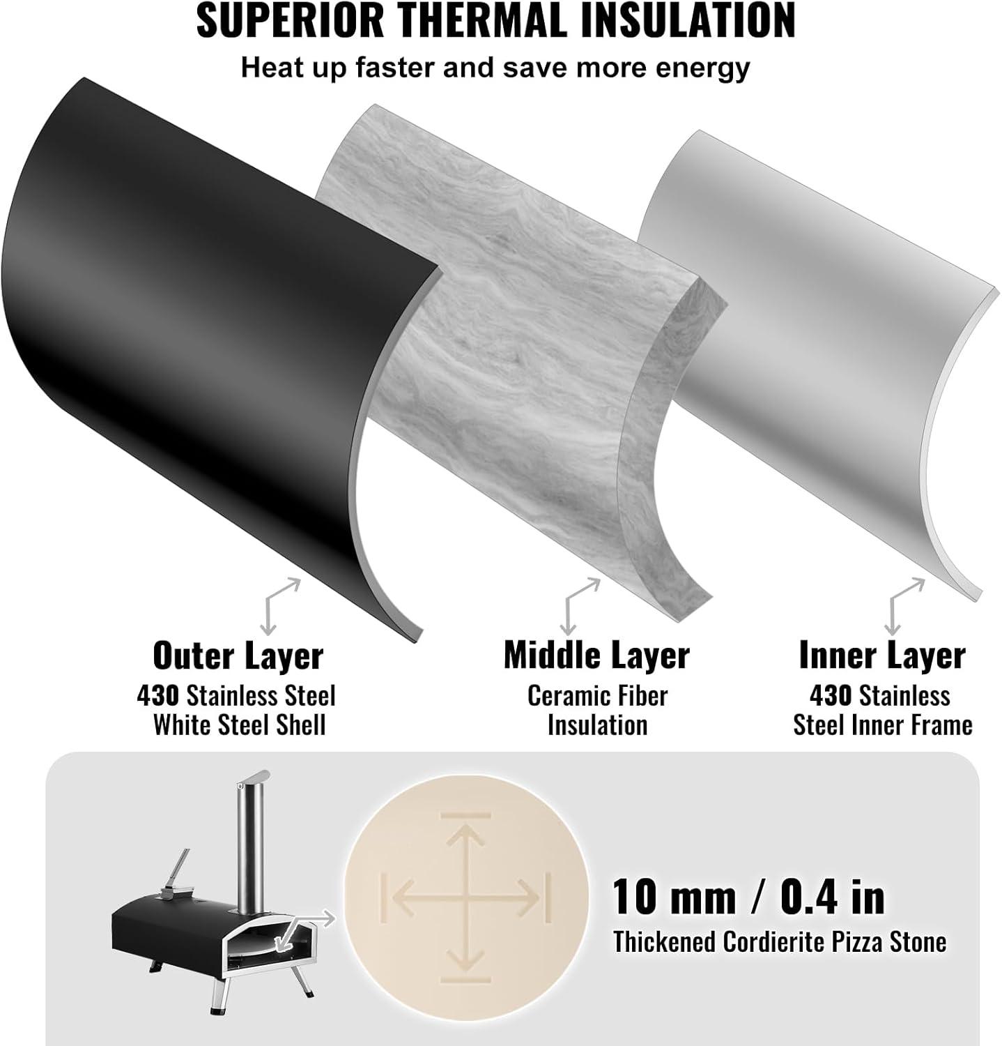 🍕 Durable Construction: VEVOR pizza oven withstands outdoor conditions and frequent use. Adopted a 3-layer design, promoting efficient heat circulation. Featuring a 430 stainless steel shell, and thick insulation cotton, it ensures durability and excellent heat retention