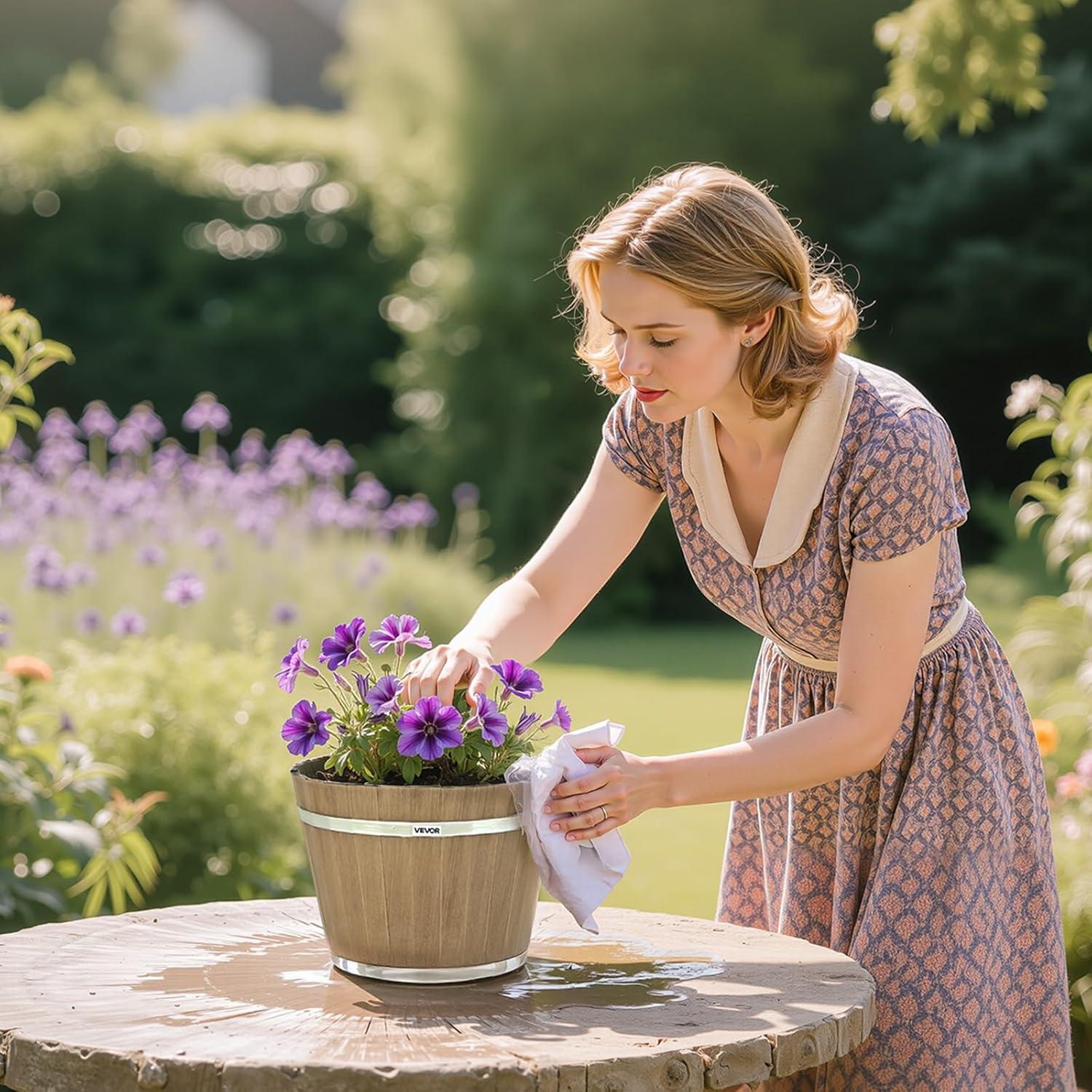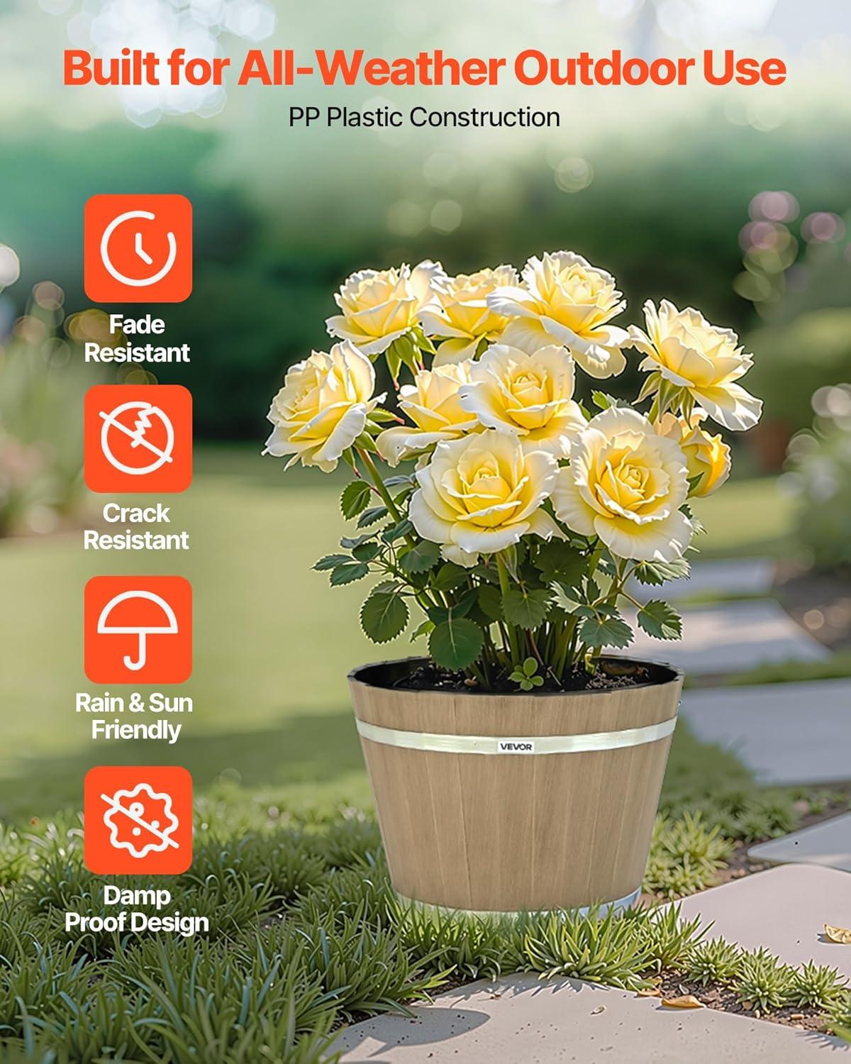 All-Weather Durable PP: Crafted from 100% recycled PP plastic, this whiskey barrel planter resists sun, rain, cracking, and fading. The smooth surface blocks dirt, stays clean in humid weather, and won't get musty—ideal for gardeners of all levels
