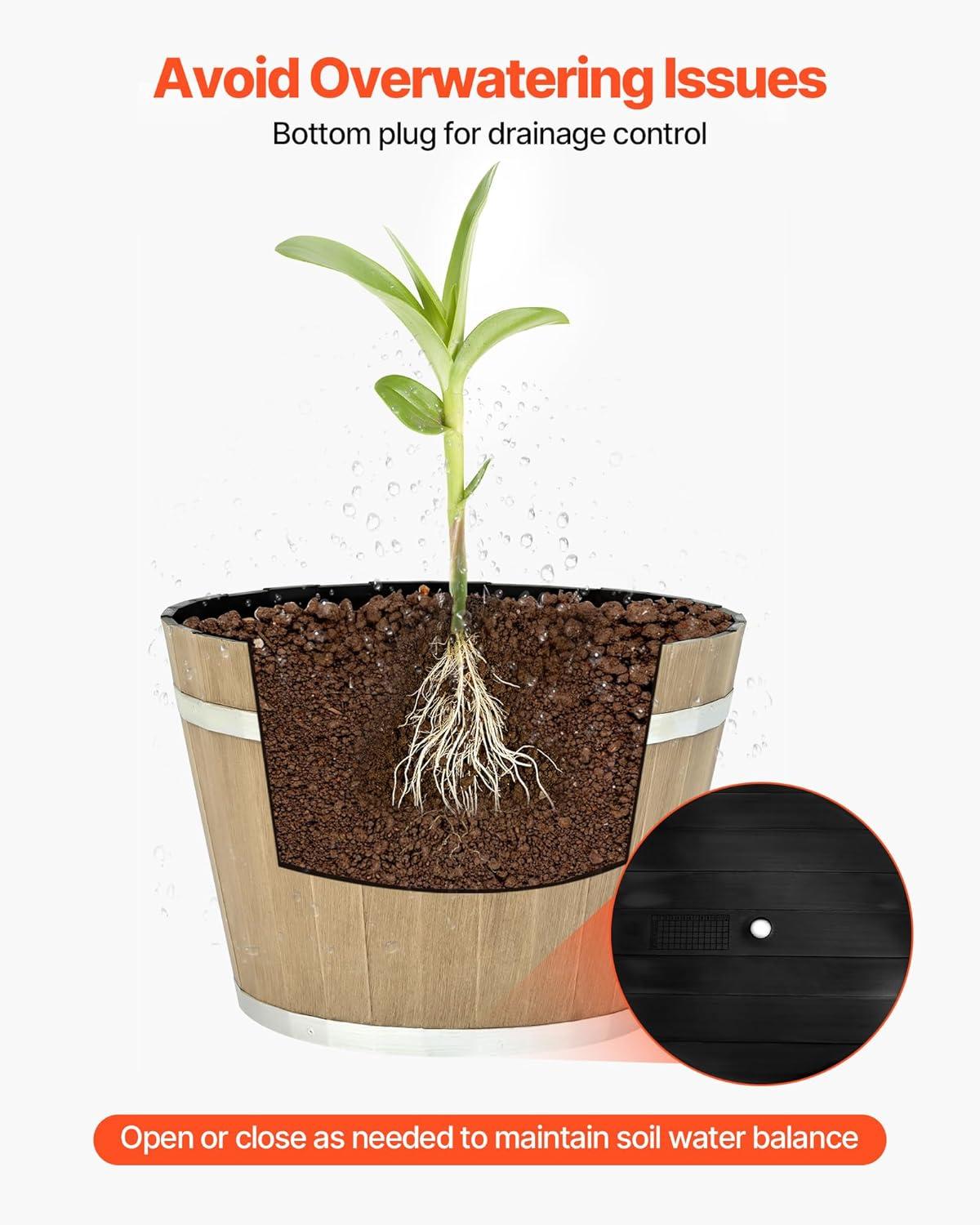 Adjustable Drainage Plug: Built-in bottom plug lets you open or close the drainage hole to suit indoor or outdoor use. The outdoor large whiskey barrel planter avoids root rot or dryness, providing a better environment for your plants to thrive