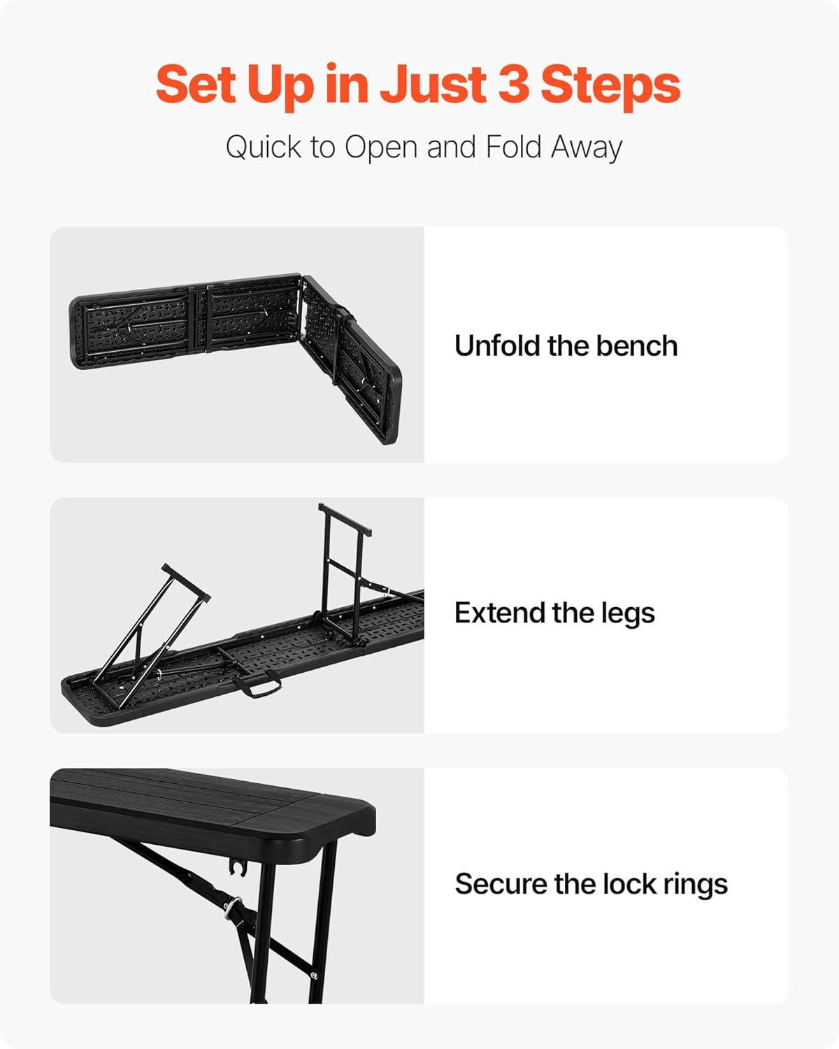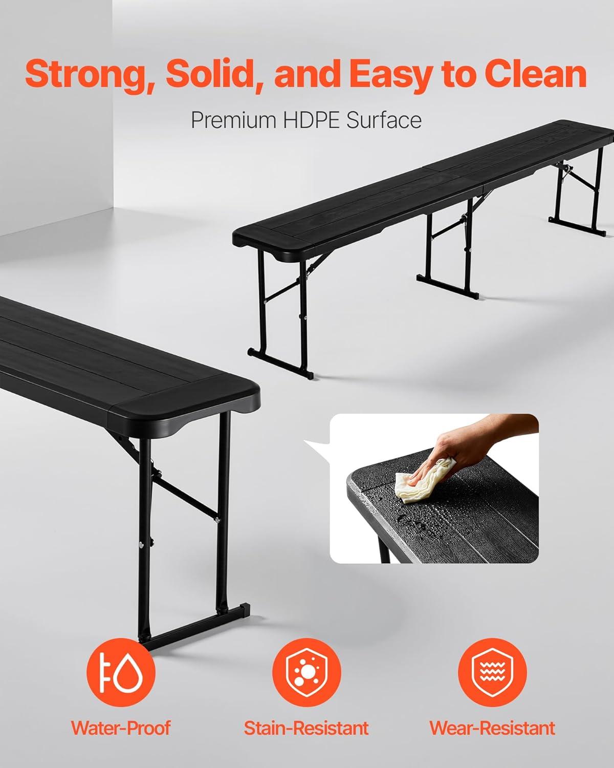 VEVOR Plastic Folding Bench, 6ft Portable Folding Bench, Smooth High Density Polyethylene Waterproof Outdoor Bench, Picnic Camping Table with Handle for Garden Soccer Playtime, White (2 Pack)(Black)