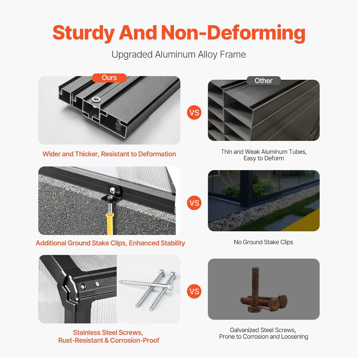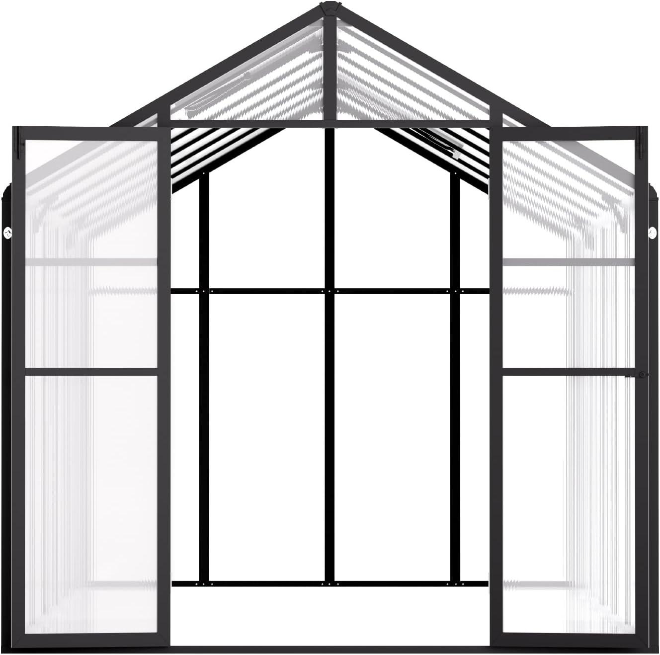 Thickened Aluminum Frame: The backyard greenhouse is equipped with a thicker and stronger black aluminum frame, which is lightweight yet highly durable, with stainless steel screws for a longer service life and better resistance to cold weather. Note: In windy or snowy weather, ensure doors and windows are closed to prevent the greenhouse from tipping over due to strong wind.