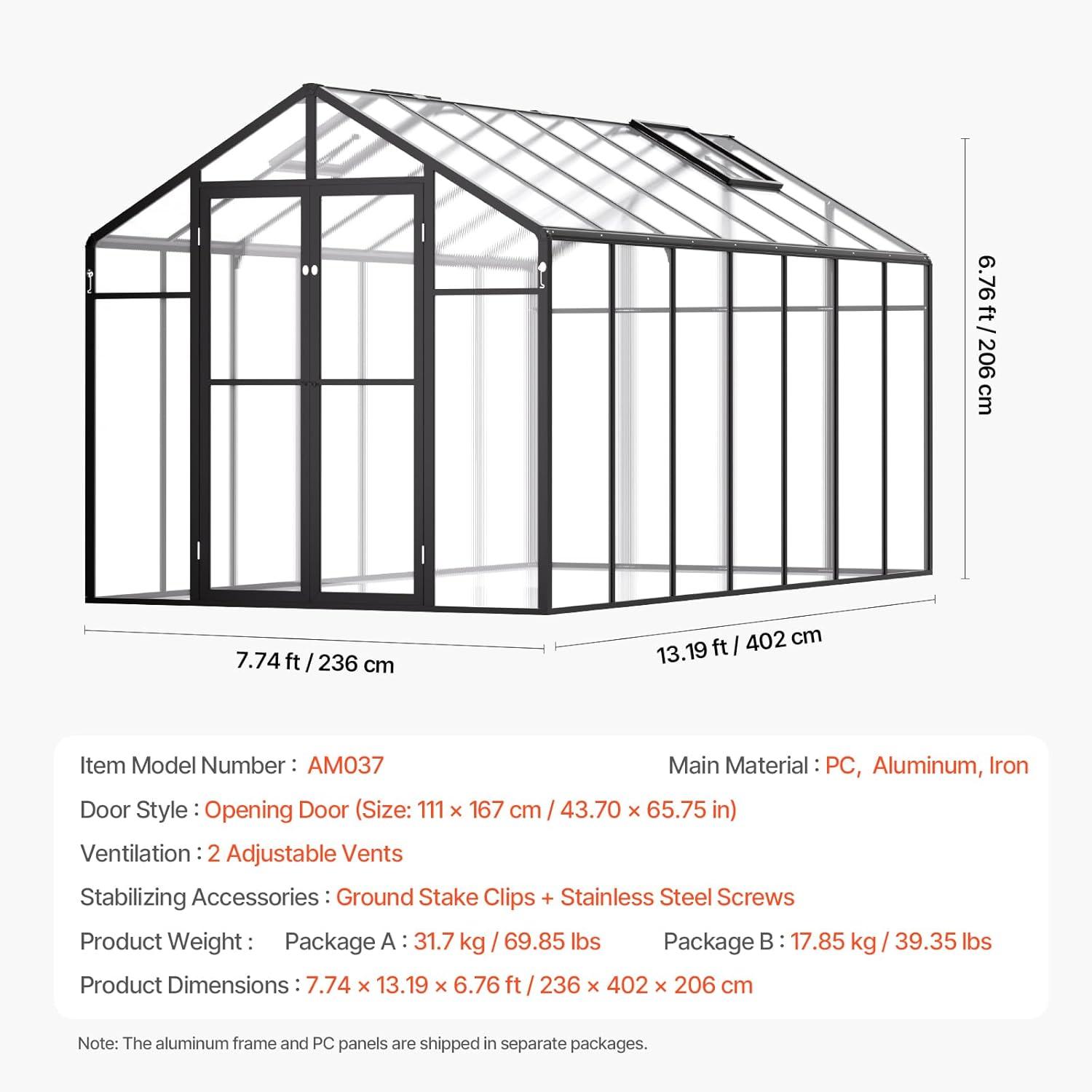 Multi-Functional Application: The outdoor greenhouse measures 7.74 x 13.22 x 6.80 ft in size, accommodating various plants, gardening tools, seeds, and pots, suitable for use in a garden or as a leisurely sunroom, practical and visually appealing.