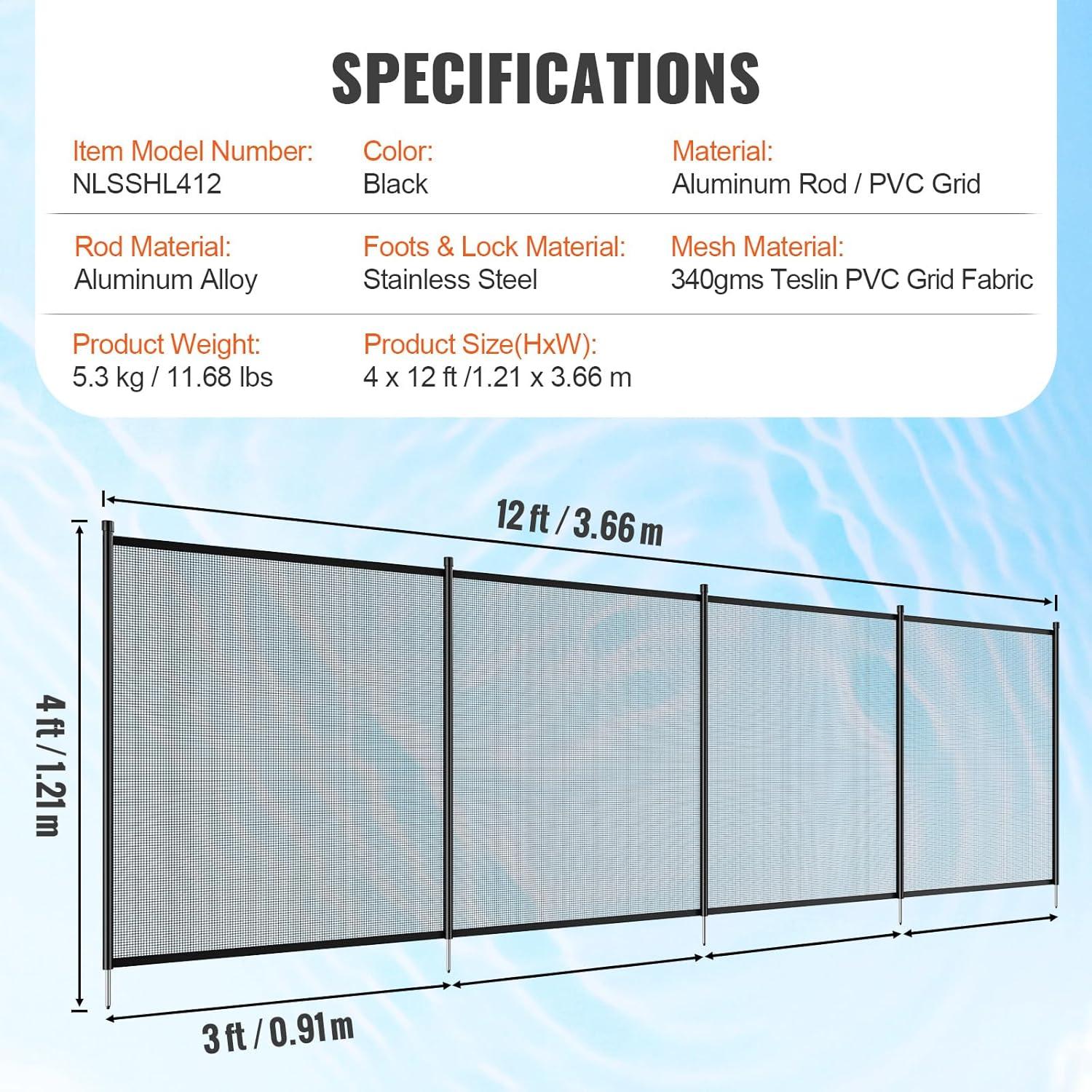 Comprehensive Protection: Our 4x12ft /1.21×3.66m pool fence offers versatile fitting for different pool shapes and sizes, especially for large pools. It not only ensures pool safety but also effectively protects pets, serving as your family's guardian.