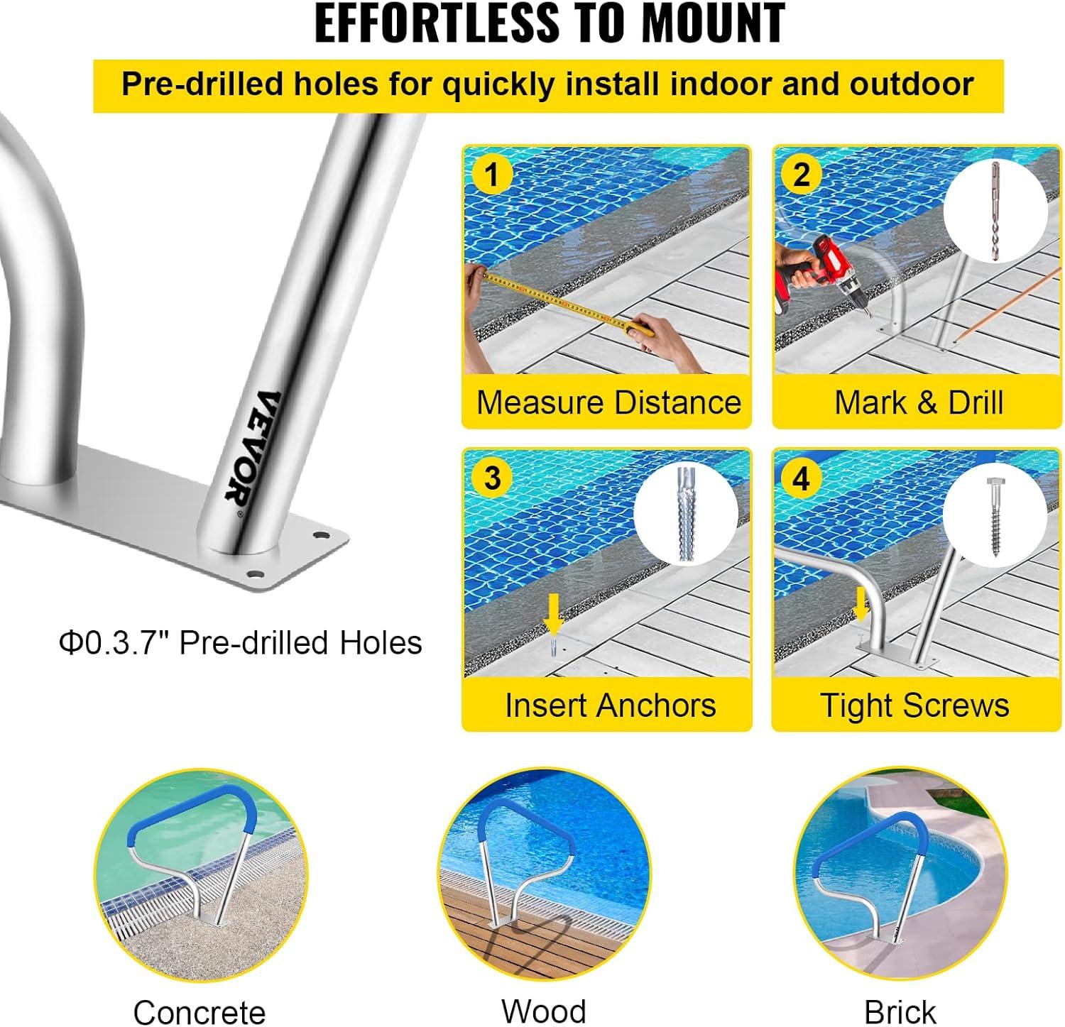 Easy to Assemble: The pool handrail has a base plate that can be installed on concrete floors, wood floors, or brick floors. It stands firmly. It is effortless to assemble by one person in a few minutes. Firstly, you should measure the distance from the tile on the inside of the pool as needed, then mark and drill the four φ0.4″/ 9.5 mm pre-drilled holes; use the included screws and anchors to tighten.