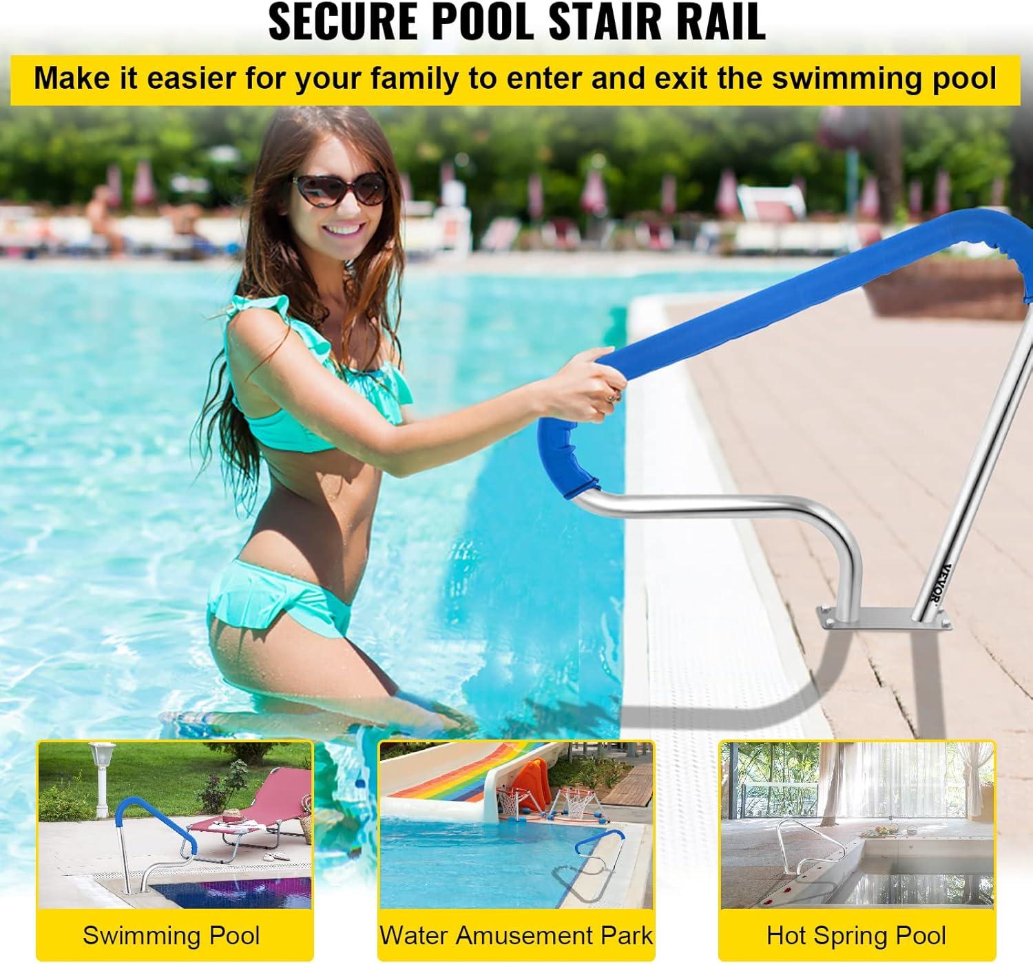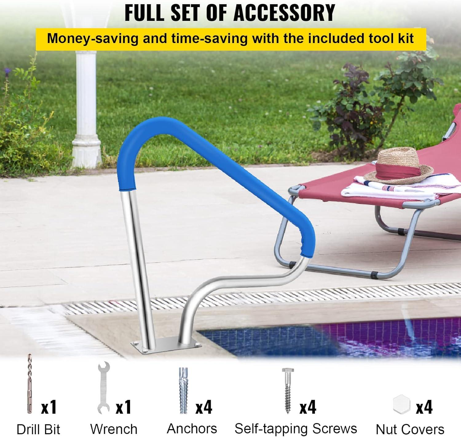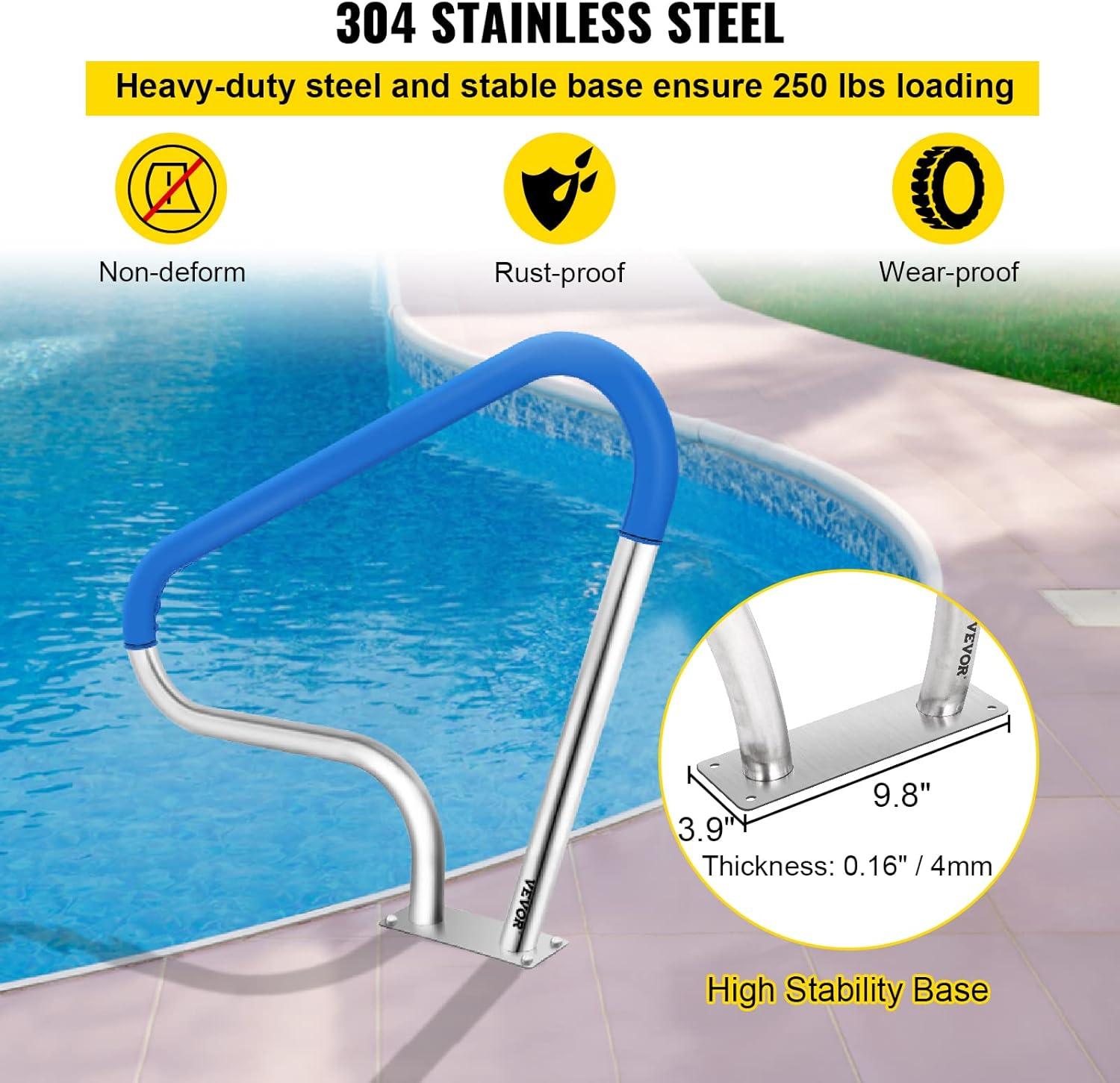 VEVOR Pool Rail 55x32 Pool Railing 304 Stainless Steel 250LBS Load Capacity Silver Rustproof Pool Handrail Humanized Swimming Pool Handrail with Blue Grip Cover & M8 Drill Bit & Self-Taping Screws(39x32 Inch)