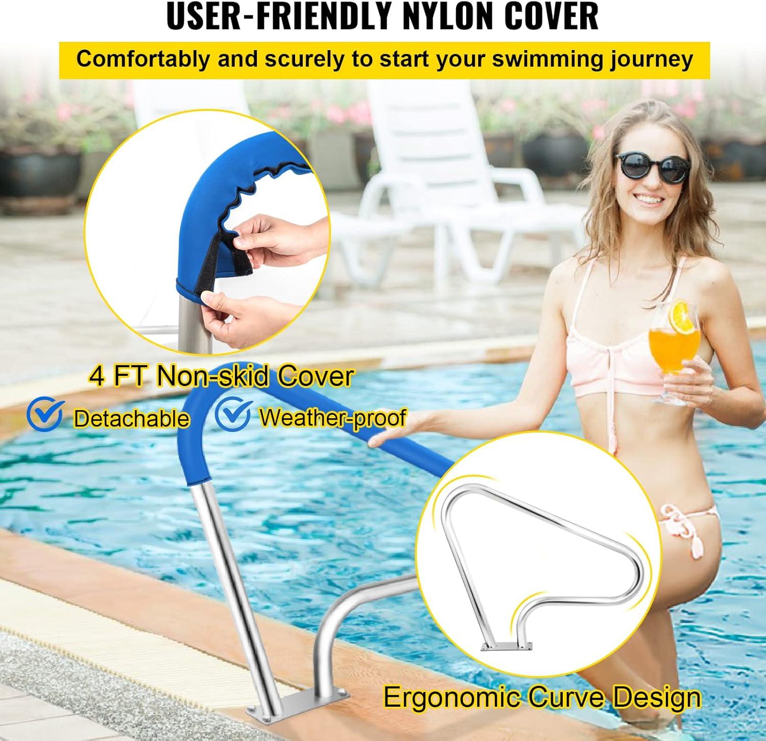 4 FT Nylon Grip Cover: 55″L x 32″H/ 139.7 x 81.2 cm pool handrail is designed specifically for providing your family with a safe and secure way to enter and exit the pool. A 4ft comfortable nylon covers the ergonomic curve grip and features excellent performance at preventing your hands from being hurt by cold or hot weather, reducing the risk of slipping even when hands are wet. The grip cover is also detachable for temporary installation.