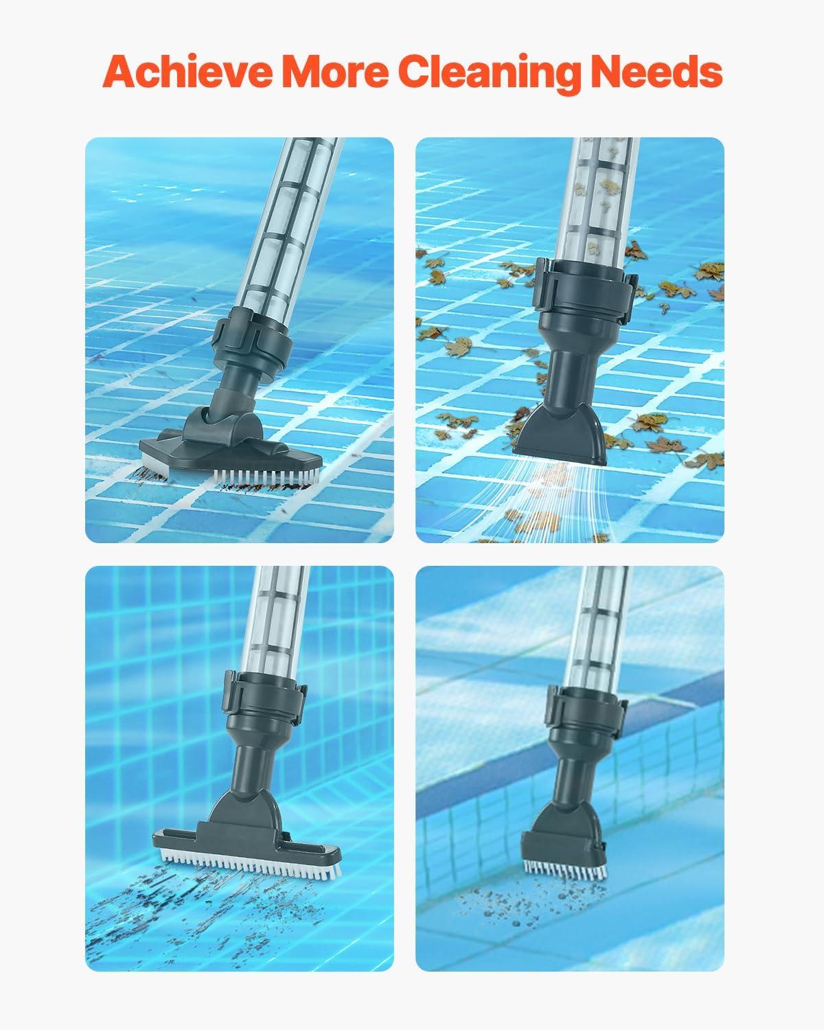 Versatile Cleaning: Featuring a modular brush head design, this handheld pool vacuum cleaner allows easy switching of brush heads for effortless cleaning of pool stairs, corners, and hard-to-reach areas. It also includes six washable filter bags, making maintenance simple and hassle-free.