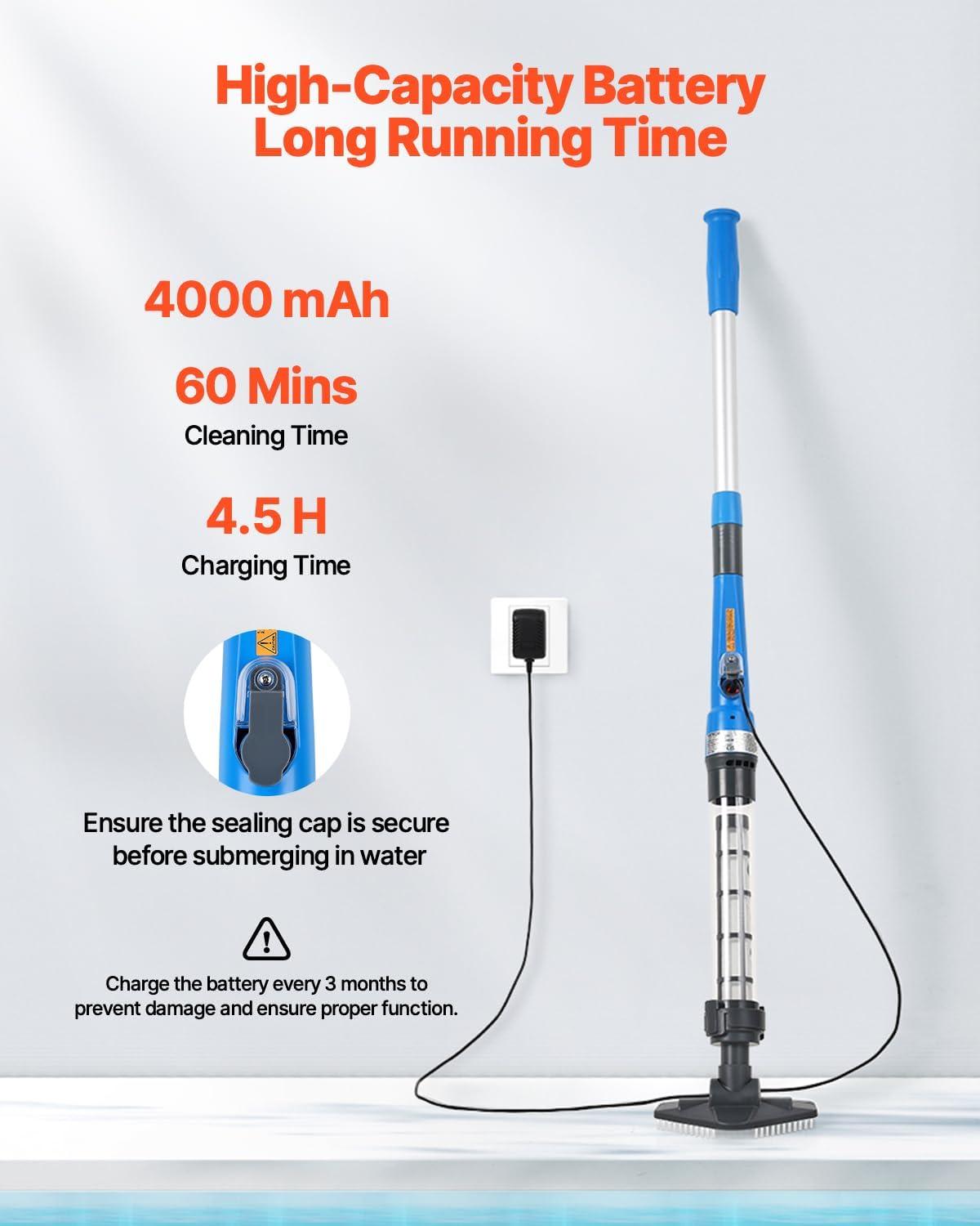 Rechargeable & Cordless Use: With a built-in 4500mAh battery, this rechargeable pool vacuum allows unrestricted movement to clean any part of your pool without power cord limitations. A full charge provides up to 60 minutes of runtime, enabling uninterrupted cleaning without frequent recharging. Note: Please fully charge before first use.