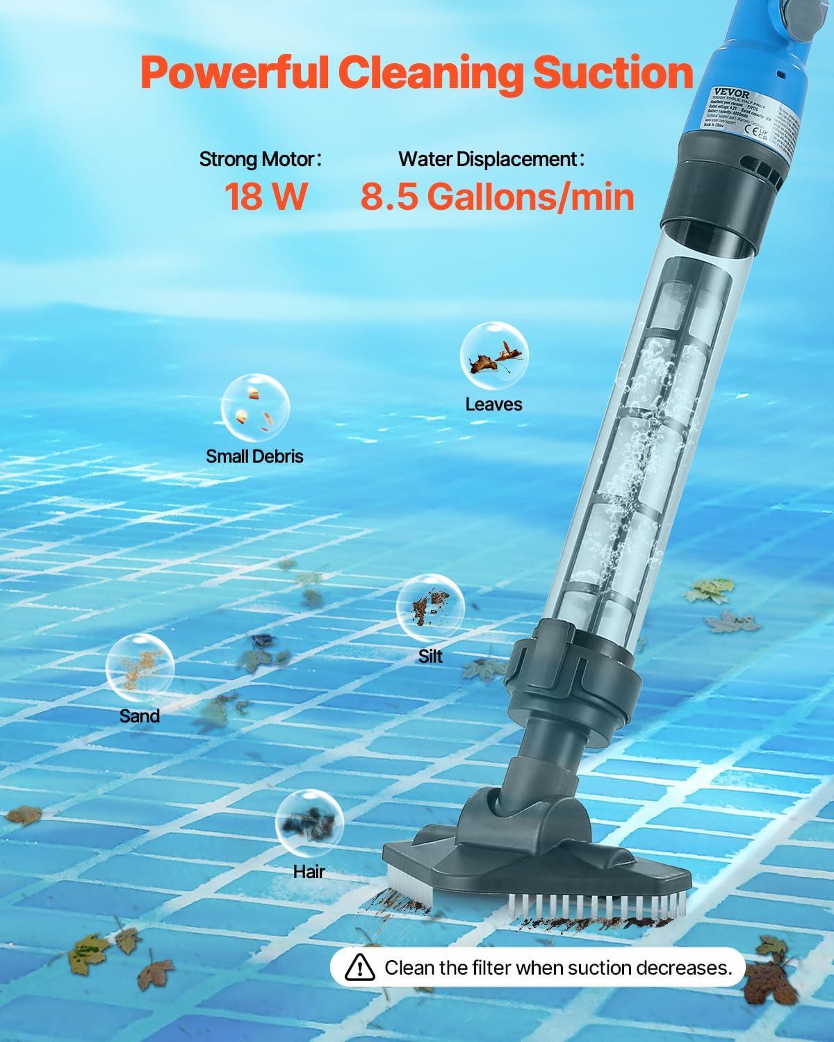 imageVEVOR Pool Vacuum 26 GPM Handheld Cordless Hot Tub Vacuum with Extension Pole for Deep Cleaning ampamp Strong Suction Rechargeable Pool Cleaner Running up to 1Hour for Above GroundInground Pool Spas18W