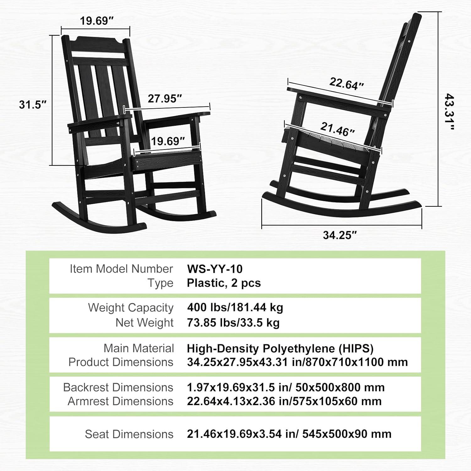 Sturdy and Durable Material: This porch rocker is made from high-density polystyrene (HIPS) material, providing solid construction with enhanced impact resistance and stability. It supports up to 400 lbs, suitable for various body types. The material resists deformation, fading, and weather conditions, ensuring long-lasting use.
