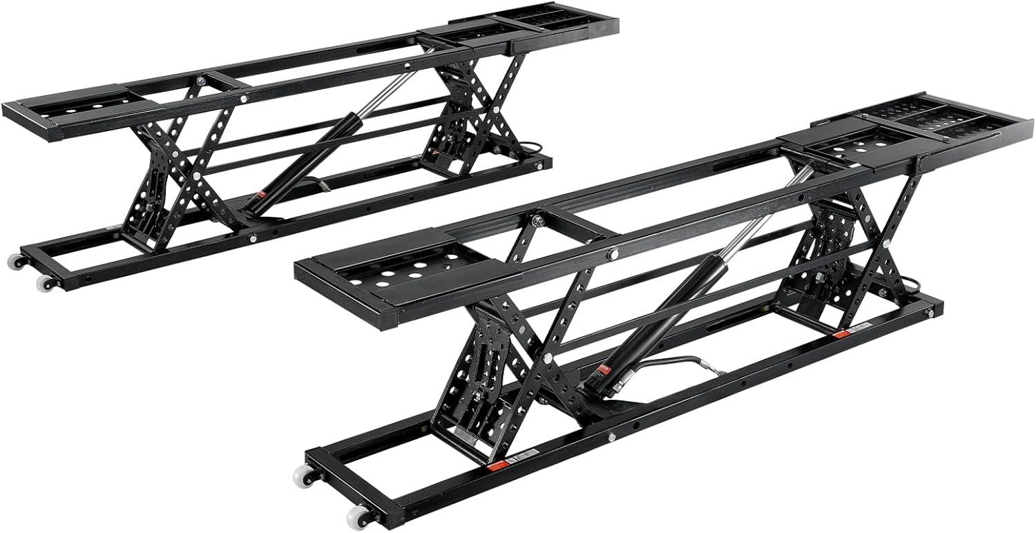 Convenient Mobility and Storage: Equipped with 4 high-strength nylon pulleys, this 4 post car lift can be moved effortlessly. When not in use, the foldable design allows for easy storage. The car scissor lift also includes two sets of handles, making it a breeze to hang on the wall for convenient and space-saving storage (hooks or nails not included).