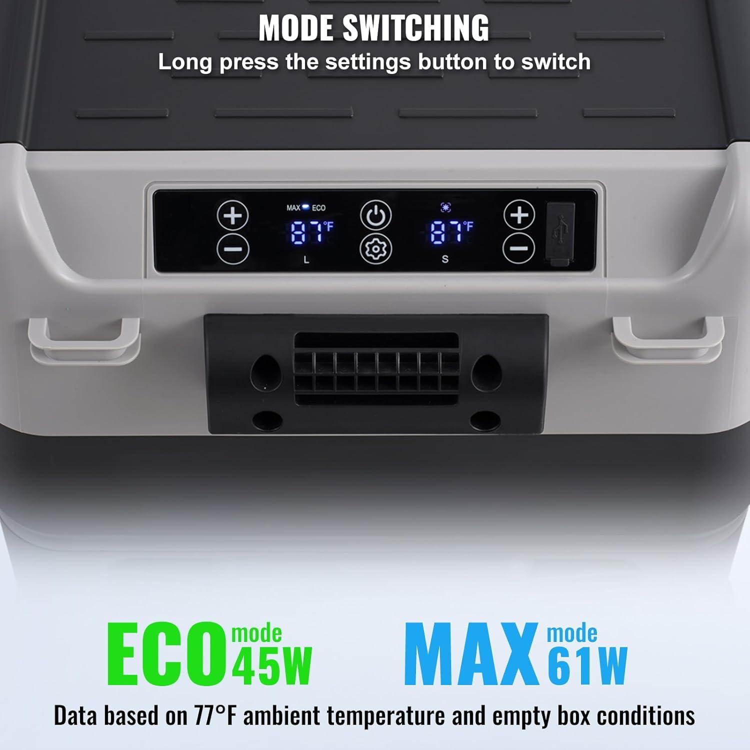 Quiet & Energy Efficient: The fridge operates with noise ≤ 45dB, ensuring you sleep well after long drives. You can also choose between ECO and Max modes via the LCD touchscreen. In ECO energy-saving mode, the operating power of this portable fridge is less than 54W. Even when running in MAX mode (71W), its intelligent circulation consumes less than 0.33 kWh/day.