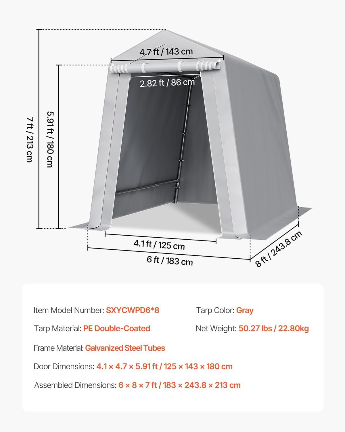 Upgraded TRIPLE-LAYER 240G Fabric Cover: VEVOR storage tent is made of double-coated PE material! With tear-resistant and fade-resistant properties, the storage sheds are sturdy enough. Plus, the 15 cm extended mopping cover provides extra stability when loading heavy objects, protecting your belongings.